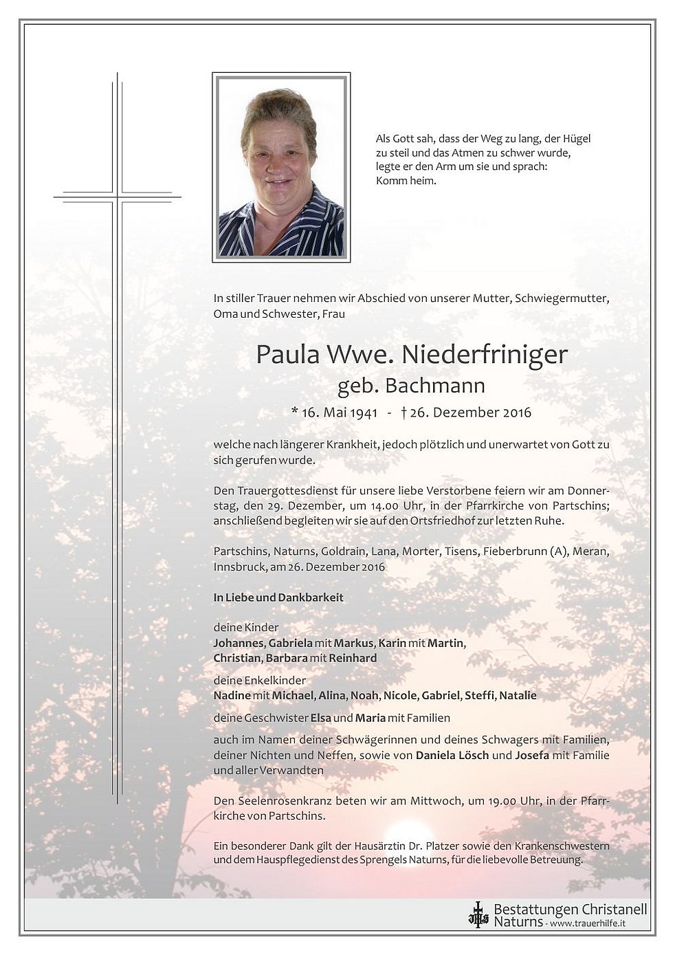 Den Trauergottesdienst für unsere liebe Verstorbene feiern wir am Donnerstag, den 29. Dezember, um 14.00 Uhr, in der Pfarrkirche von Partschins; anschließend begleiten wir sie auf den Ortsfriedhof zur letzten Ruhe.