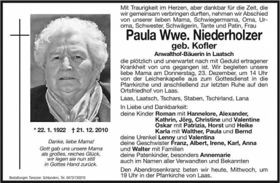 Wir begleiten unsere liebe Mama am Donnerstag, 23. Dezember, um 14 Uhr von der Leichenkapelle aus zum Gottesdienst in die Pfarrkirche und anschließend zur letzten Ruhe auf den Ortsfriedhof von Laas.