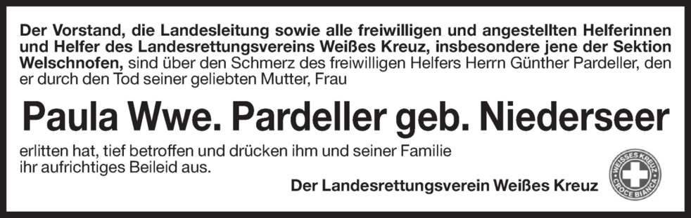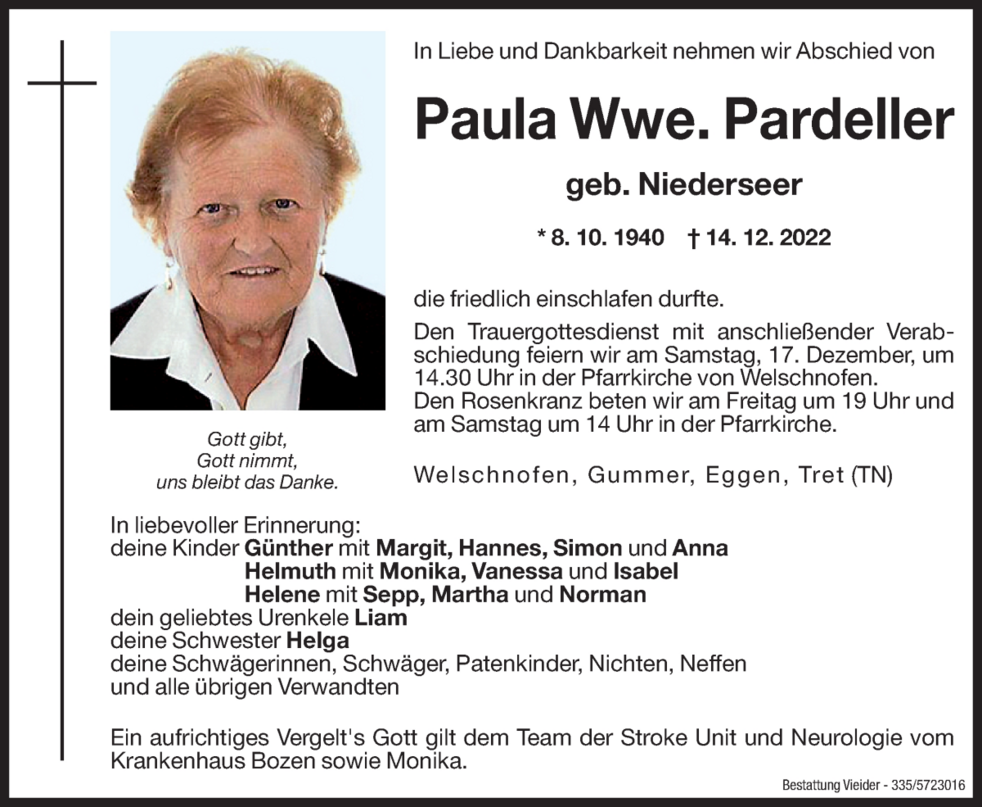 Den Trauergottesdienst mit anschließender Verabschiedung feiern wir am Samstag, 17. Dezember, um 14.30 Uhr in der Pfarrkirche von Welschnofen.