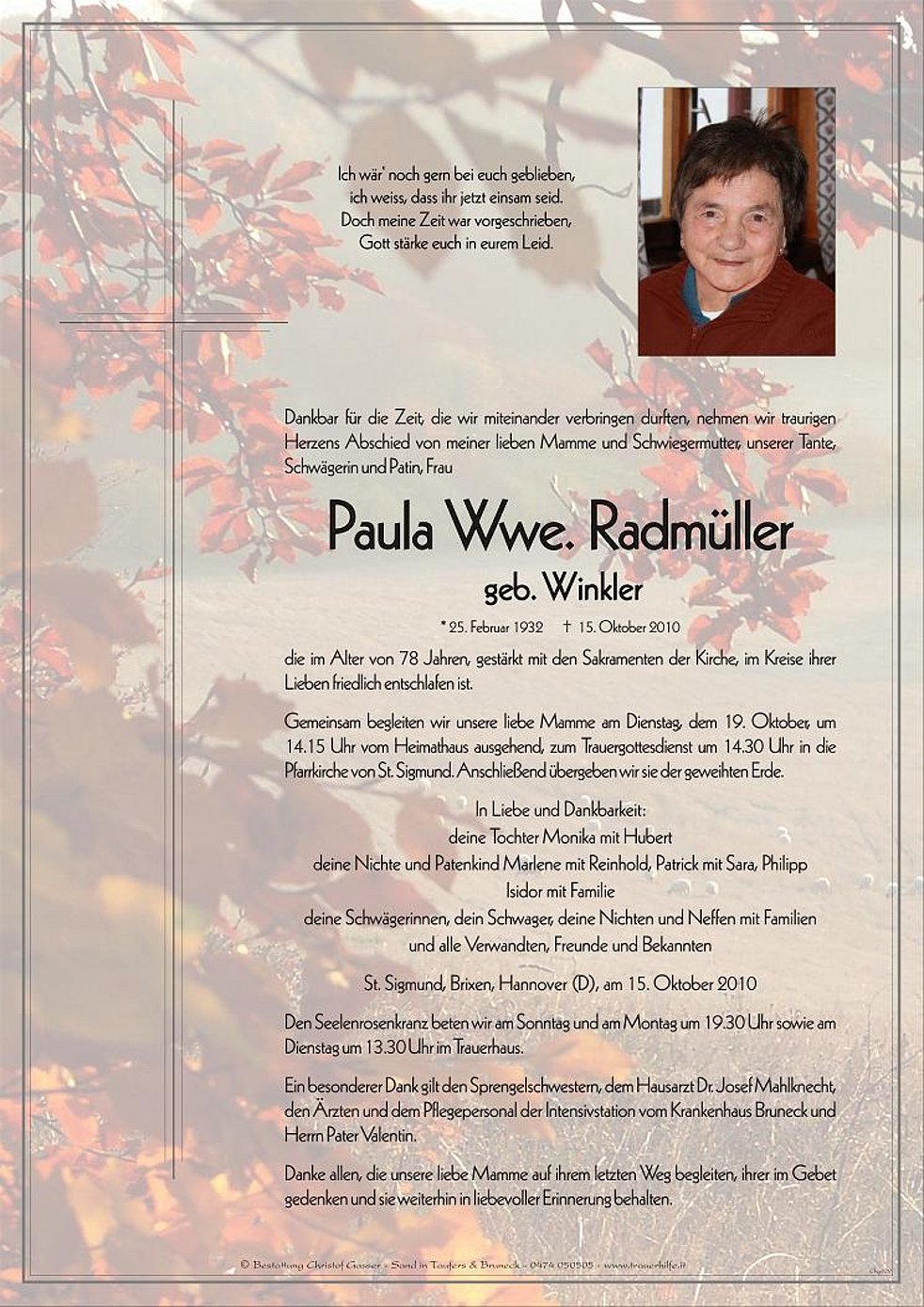 Gemeinsam begleiten wir unsere liebe Mamme am Dienstag, dem 19. Oktober, um 14.15 Uhr vom Heimathaus ausgehend, zum Trauergottesdienst um 14.30 Uhr in die Pfarrkirche von St. Sigmund. Anschließend übergeben wir sie der geweihten Erde.