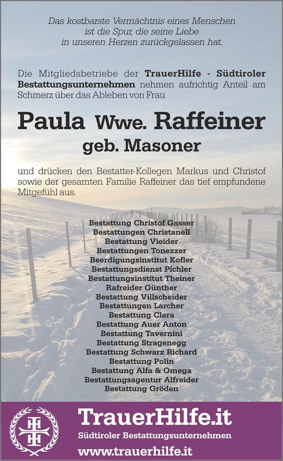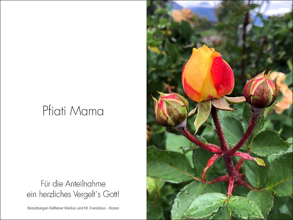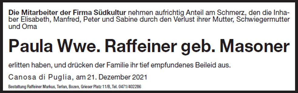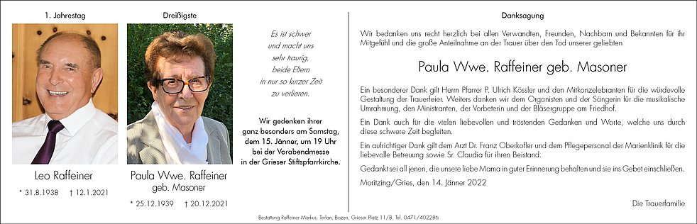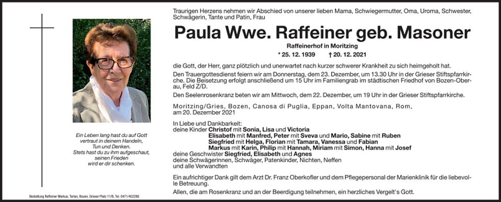 Den Trauergottesdienst feiern wir am Donnerstag, dem 23. Dezember, um 13.30 Uhr in der Grieser Stiftspfarrkirche. Die Beisetzung erfolgt anschließend um 15 Uhr im Familiengrab am städtischen Friedhof von Bozen-Oberau, Feld Z/D