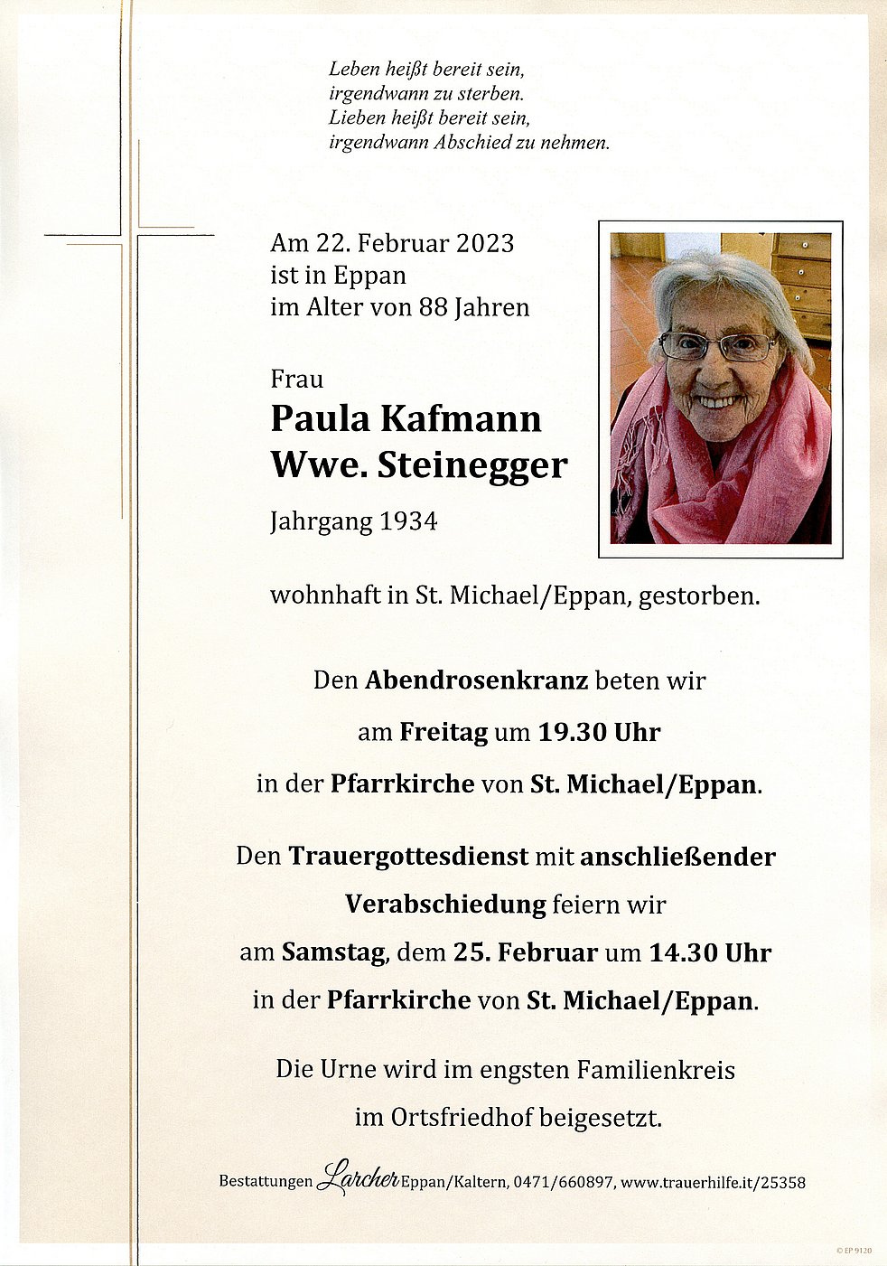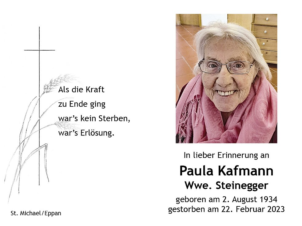 Den Trauergottesdienst mit anschließender Verabschiedung feiern wir am Samstag, dem 25. Februar um 14.30 Uhr in der Pfarrkirche von St. Michael/Eppan.