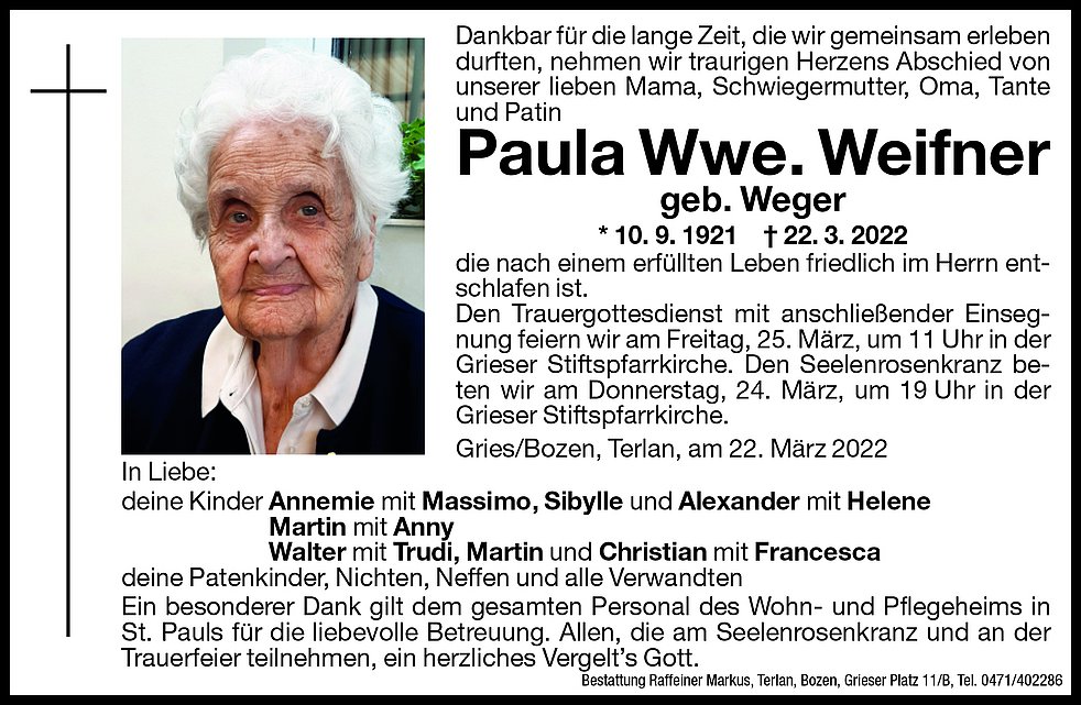 Den Trauergottesdienst mit anschlieβender Einsegnung feiern wir am Freitag, dem 25. März, um 11 Uhr in der Grieser Stiftspfarrkirche.