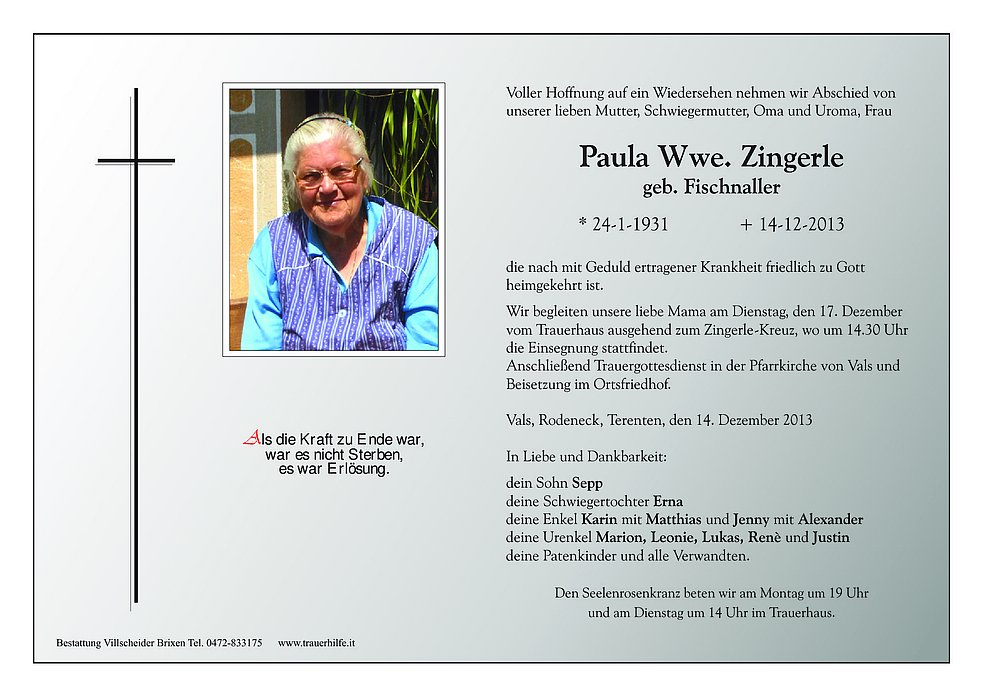 Wir begleiten unsere liebe Mama am Dienstag, den 17. Dezember vom Trauerhaus ausgehend zum Zingerle-Kreuz, wo um 14.30 Uhr die Einsegnung stattfindet.