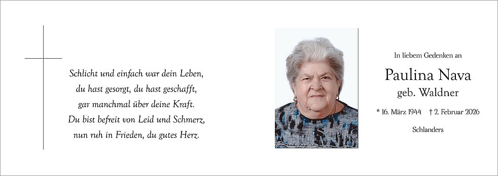 Am Mittwoch, 4. Februar, um 14 Uhr feiern wir den Begräbnisgottesdienst in der Pfarrkirche von Schlanders. Anschließend erfolgt die Beisetzung im Ortsfriedhof.