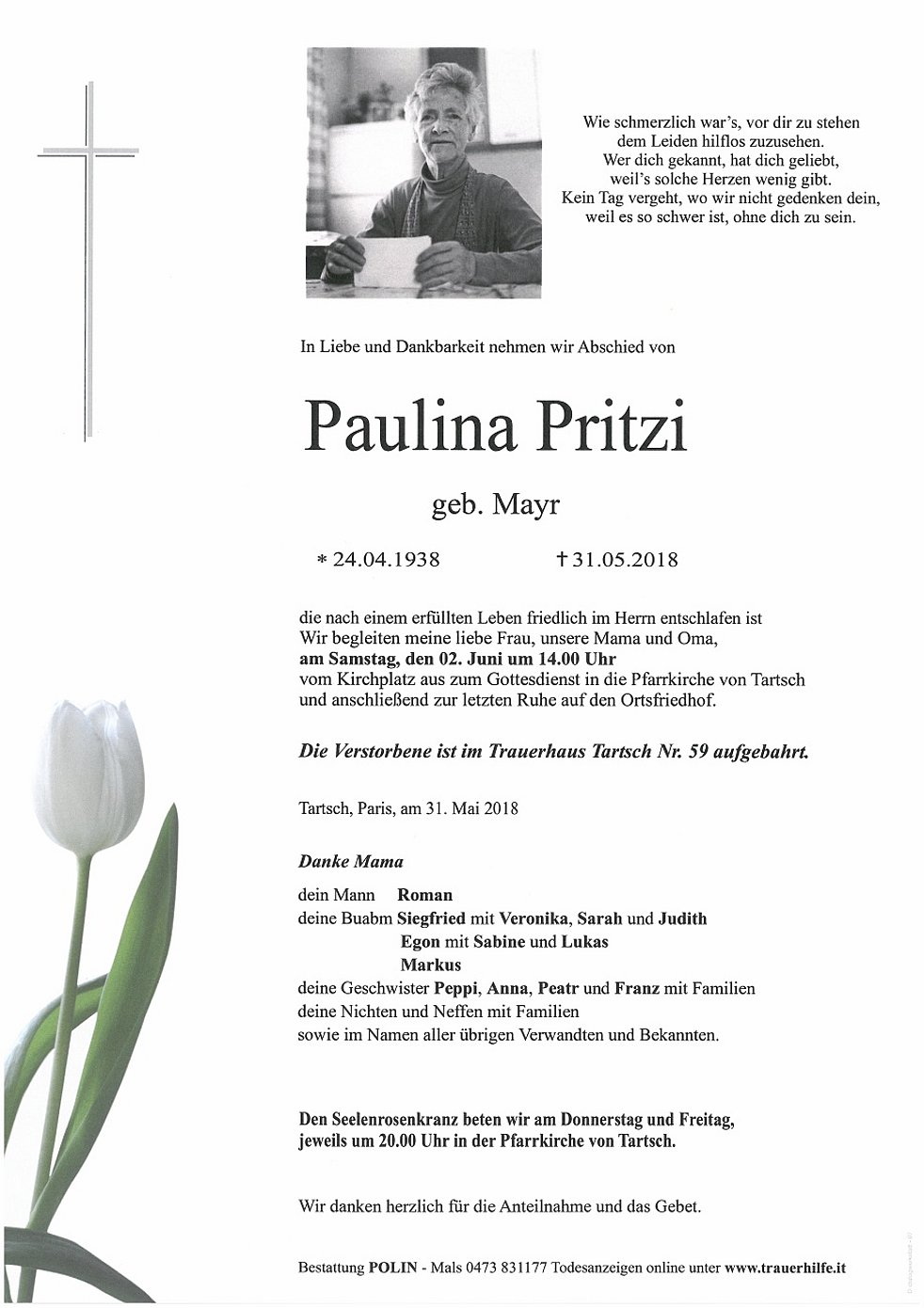 Die Verstorbene ist im Trauerhaus Tartsch Nr. 59 aufgebahrt.