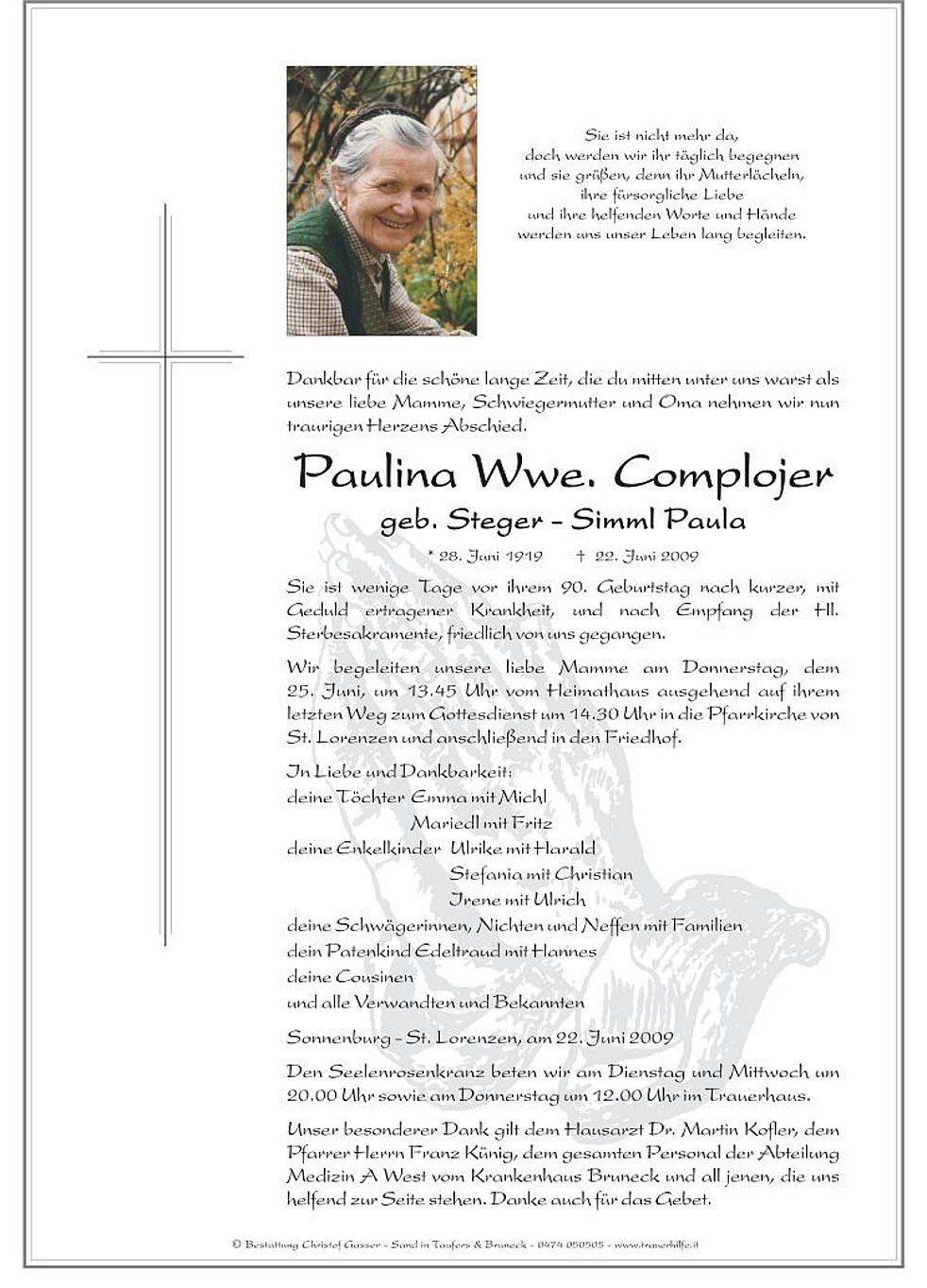 Sie ist wenige Tage vor ihrem 90. Geburtstag nach kurzer, mit Geduld ertragener Krankheit, und nach Empfang der Hl. Sterbesakramente, friedlich von uns gegangen.