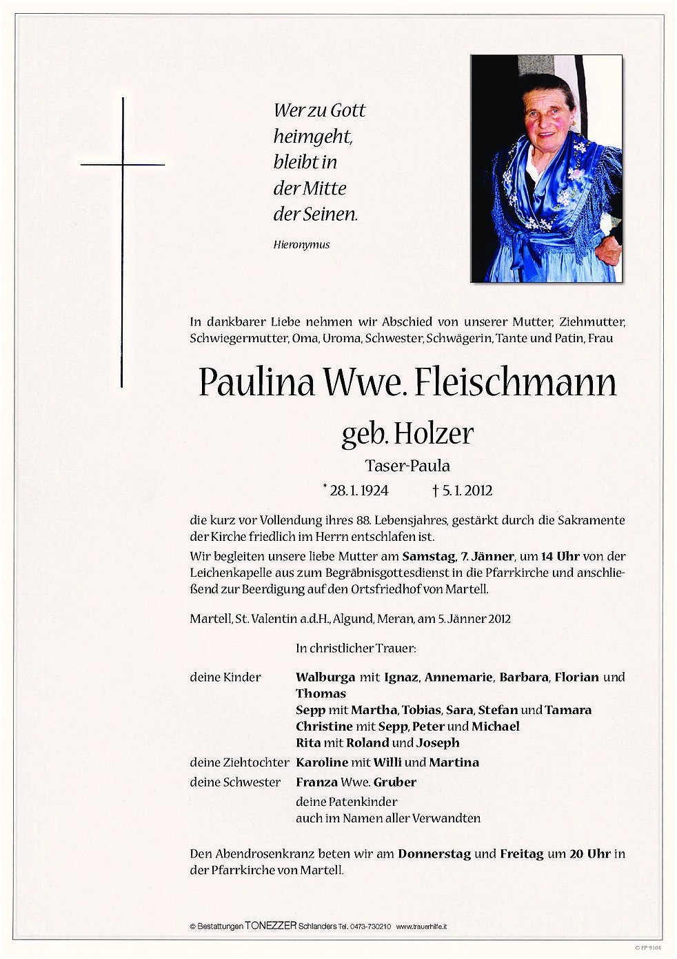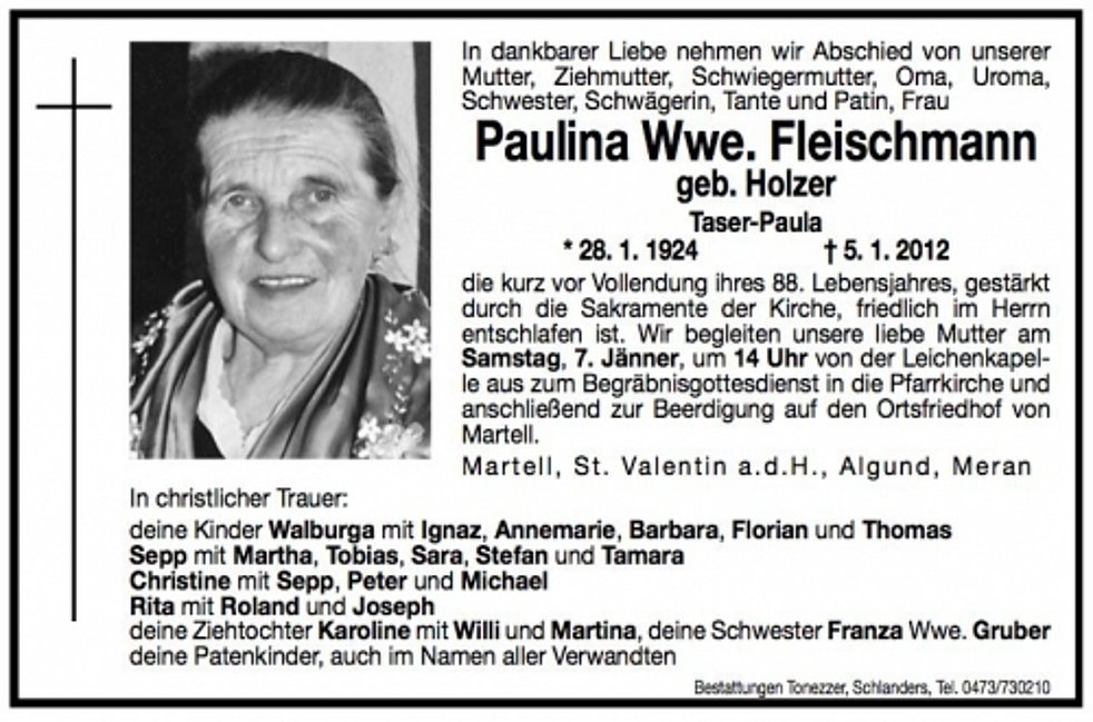 Wir begleiten unsere liebe Mutter am Samstag, 7. Jänner, um 14 Uhr von der Leichenkapelle aus zum Begräbnisgottesdienst in die Pfarrkirche und anschließend zur Beerdigung auf den Ortsfriedhof von Martell.