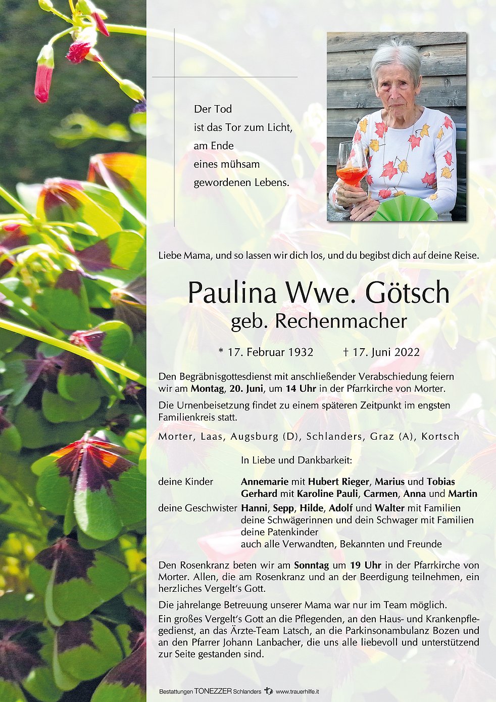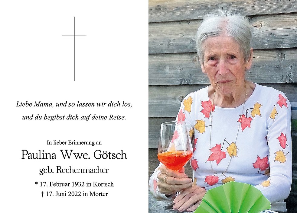 Den Begräbnisgottesdienst mit anschließender Verabschiedung feiern wir am Montag, 20. Juni, um 14 Uhr in der Pfarrkirche von Morter.