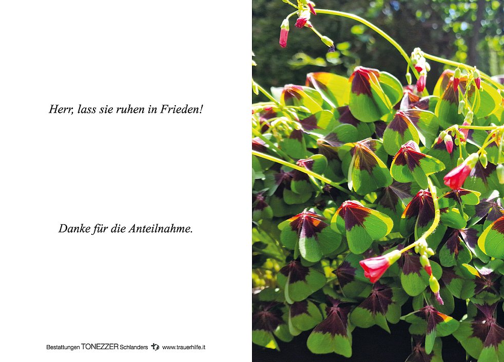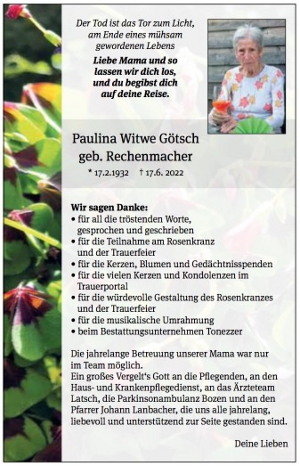 Die jahrelange Betreuung unserer Mama war nur im Team möglich. Ein großes Vergelt‘s Gott an die Pflegenden, an den Haus- und Krankenpflegedienst, an das Ärzte-Team Latsch, an die Parkinsonambulanz Bozen und an den Pfarrer Johann Lanbacher, die uns alle liebevoll und unterstützend zur Seite gestanden sind.