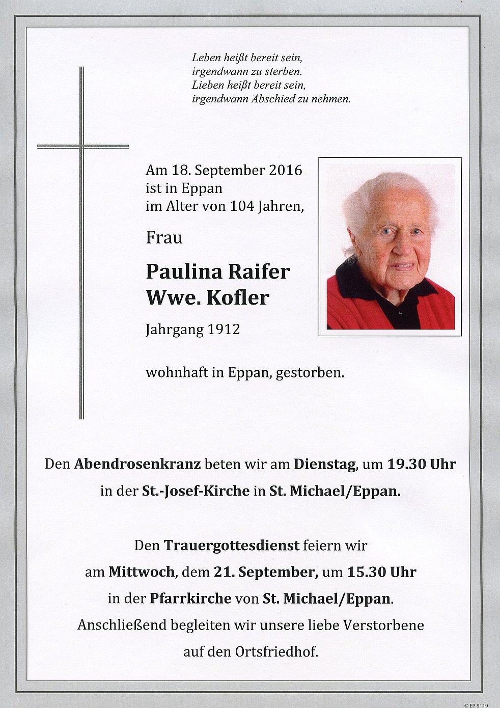 Den Trauergottesdienst feiern wir am Mittwoch, dem 21. September um 15.30 Uhr in der Pfarrkirche von St. Michael/Eppan. Anschließend begleiten wir unsere liebe Verstorbene auf den Ortsfriedhof. Den Seelenrosenkranz beten wir am Dienstag, um 19.30 Uhr in der St.-Josefs-Kirche in St. Michael/Eppan.