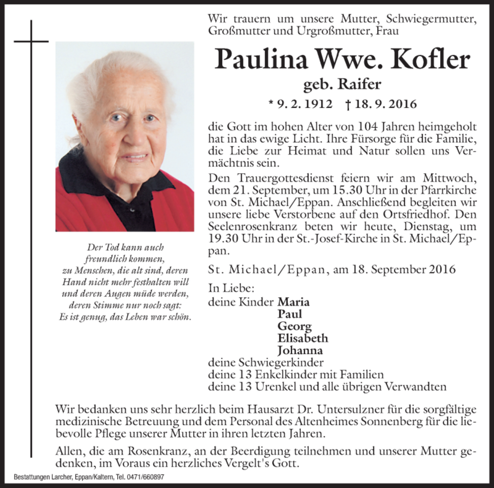 Paulina Wwe. Kofler geb. Raifer