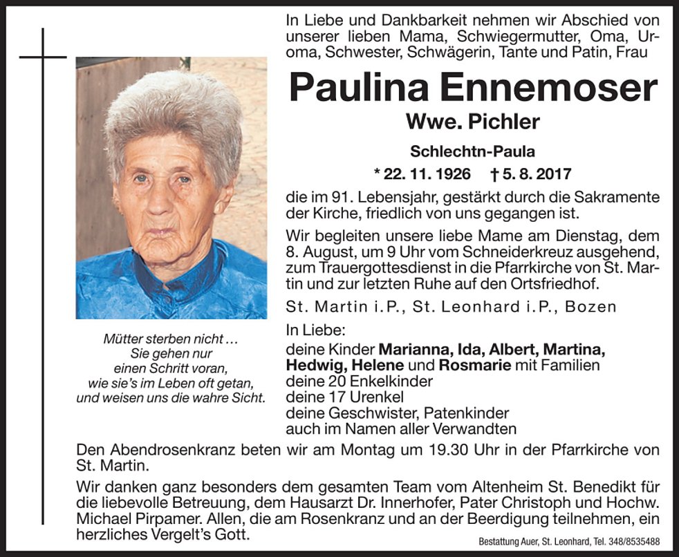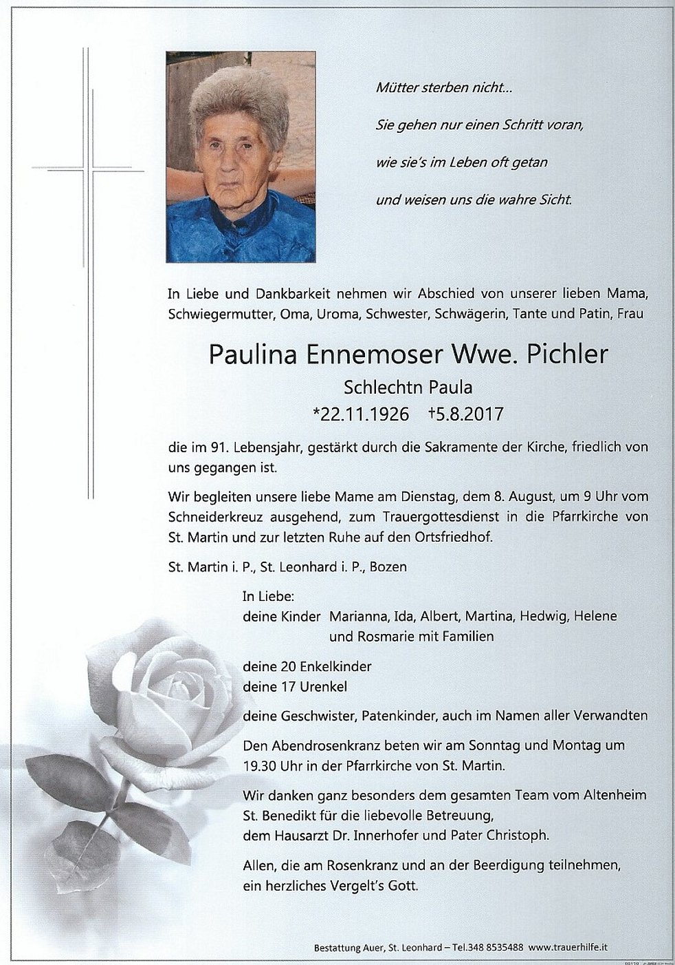 Wir danken ganz besonders dem gesamten Team vom Altenheim St. Benedikt für die liebevolle Betreuung, dem Hausarzt Dr. Innerhofer und Pater Christoph.