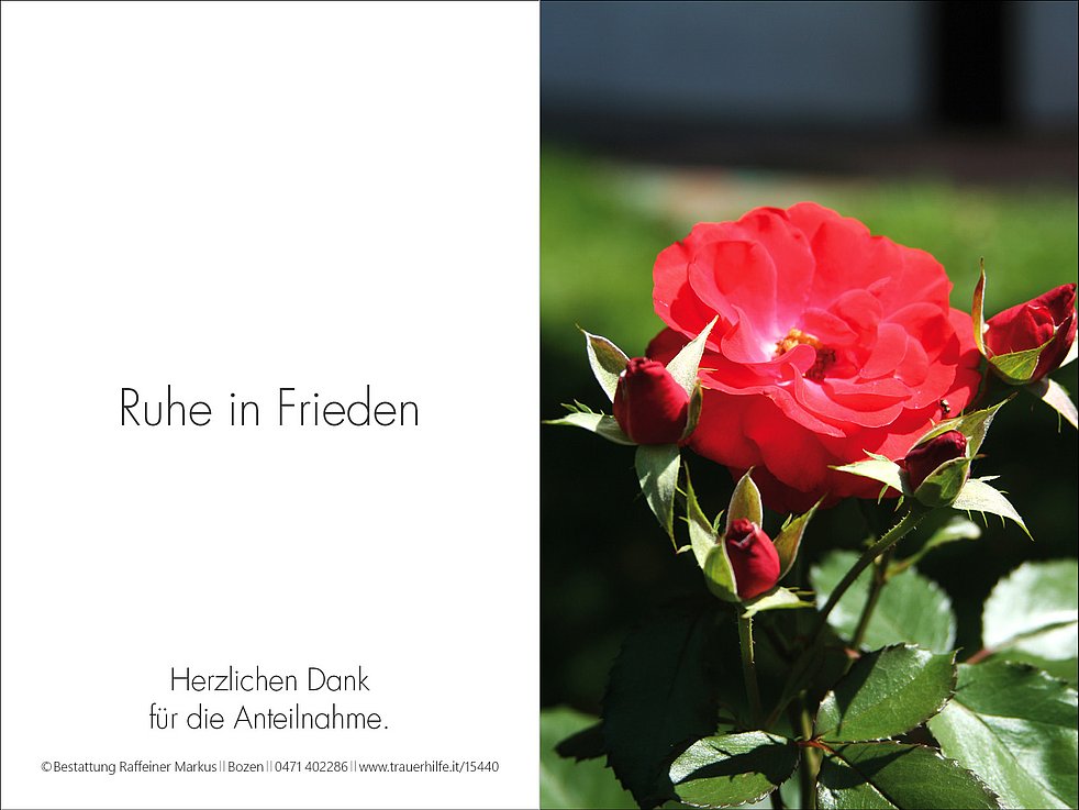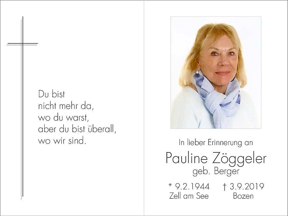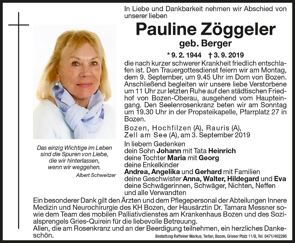 Den Trauergottesdienst feiern wir am Montag, dem 9. September, um 9.45 Uhr im Dom von Bozen. Anschlieβend begleiten wir unsere liebe Verstorbene um 11 Uhr zur letzten Ruhe auf den städtischen Friedhof von Bozen-Oberau, ausgehend vom Haupteingang.