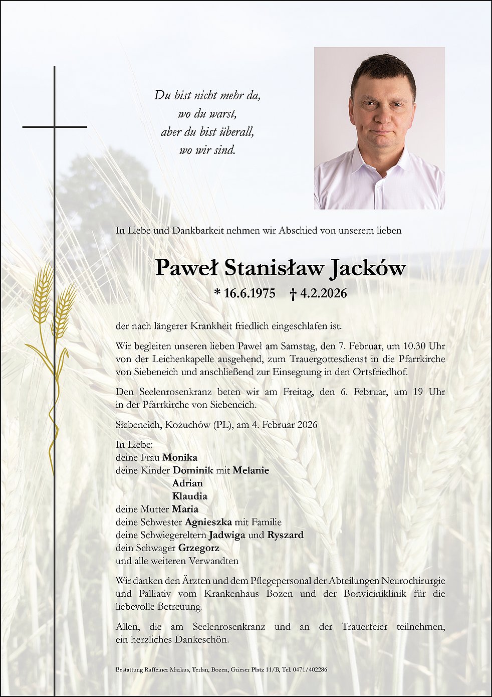 Wir begleiten unseren lieben Paweł am Samstag, den 7. Februar, um 10.30 Uhr von der Leichenkapelle ausgehend, zum Trauergottesdienst in die Pfarrkirche von Siebeneich und anschließend zur Einsegnung in den Ortsfriedhof.