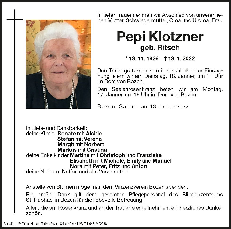 Anstelle von Blumen möge man dem Vinzenzverein Bozen spenden.