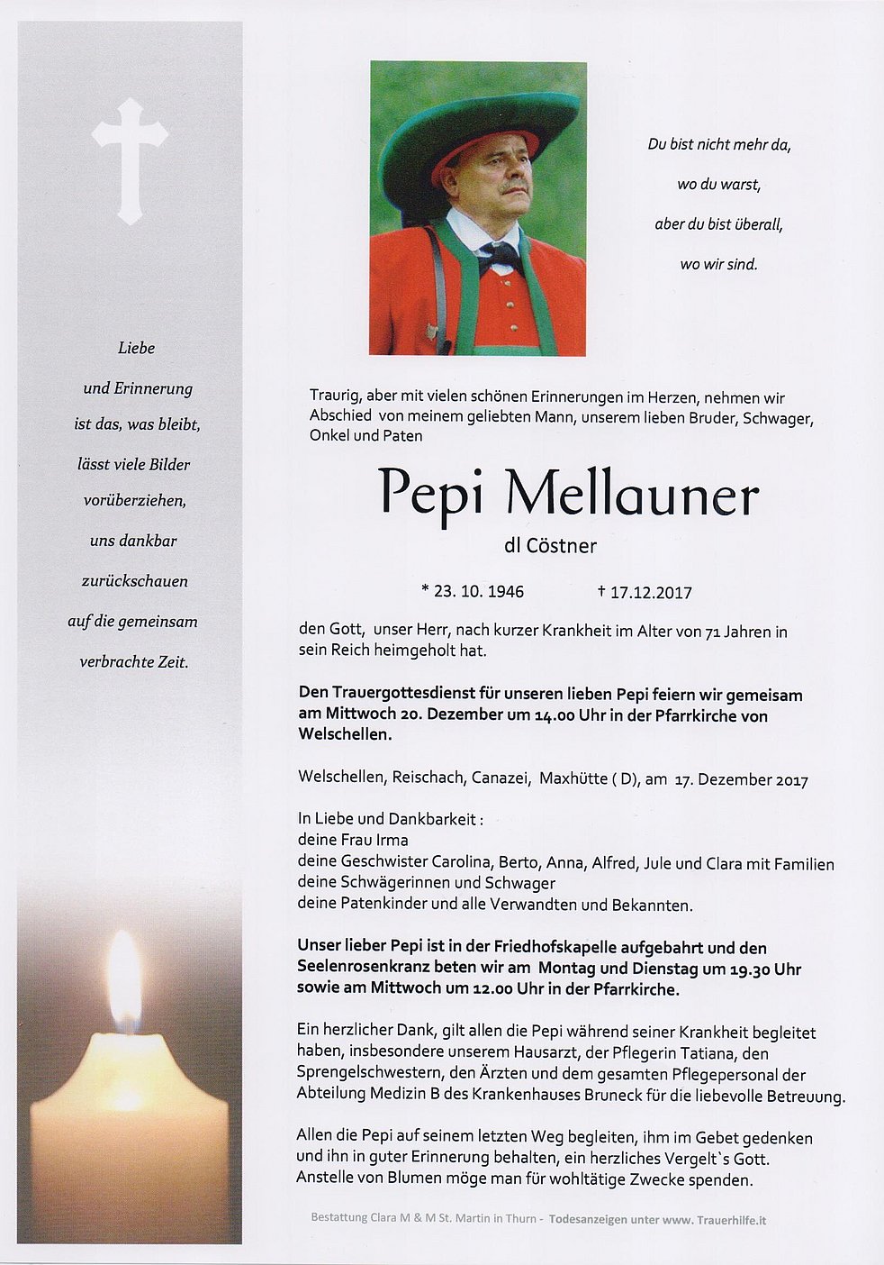 Ein herzlicher Dank, gilt allen die Pepi während seiner Krankheit begleitet haben, insbesondere unserem Hausarzt, der Pflegerin Tatiana, den Sprengelschwestern, den Ärzten und dem gesamten Pflegepersonal der Abteilung Medizin B des Krankenhauses Bruneck für die liebevolle Betreuung.