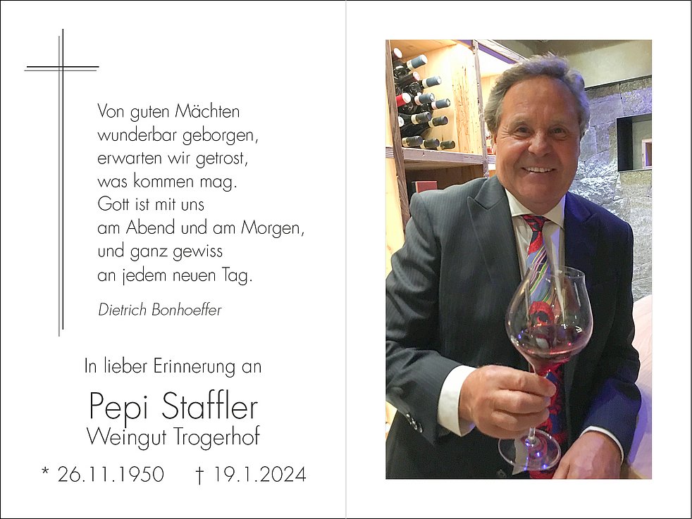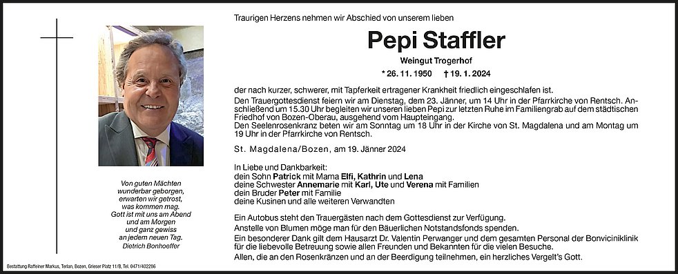 Den Trauergottesdienst feiern wir am Dienstag, dem 23. Jänner, um 14 Uhr in der Pfarrkirche von Rentsch. Anschließend um 15.30 Uhr begleiten wir unseren lieben Pepi zur letzten Ruhe zum Familiengrab auf den städtischen Friedhof von Bozen-Oberau, ausgehend vom Haupteingang.