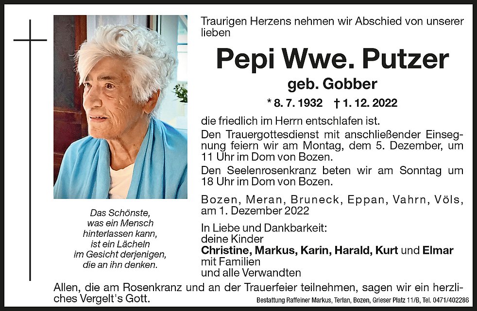 Den Trauergottesdienst mit anschließender Einsegnung feiern wir am Montag, dem 5. Dezember, um 11 Uhr im Dom von Bozen.