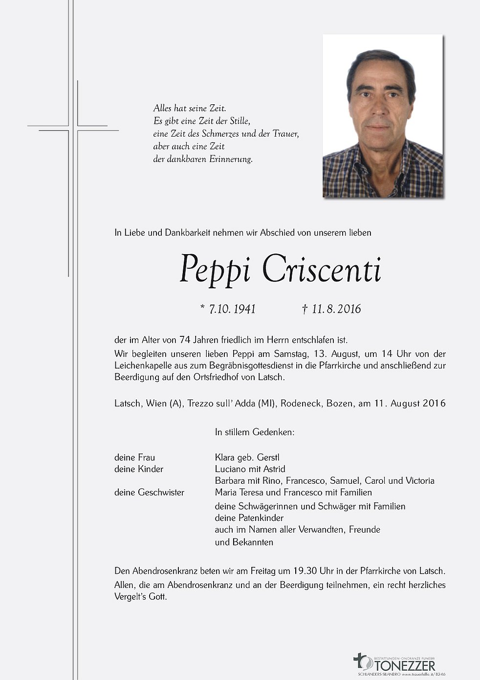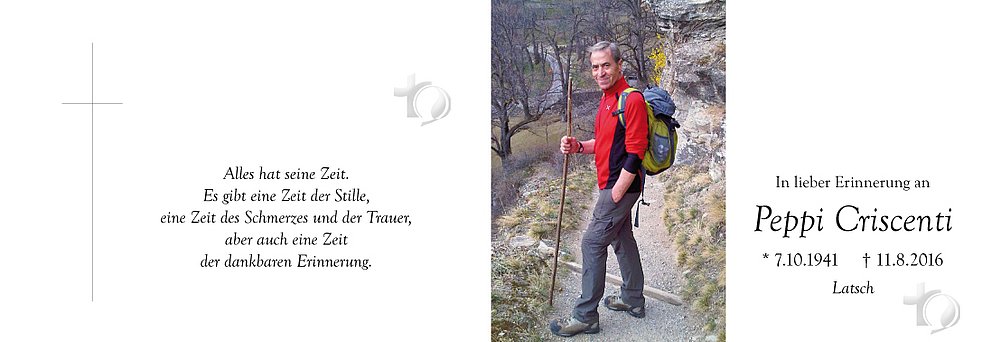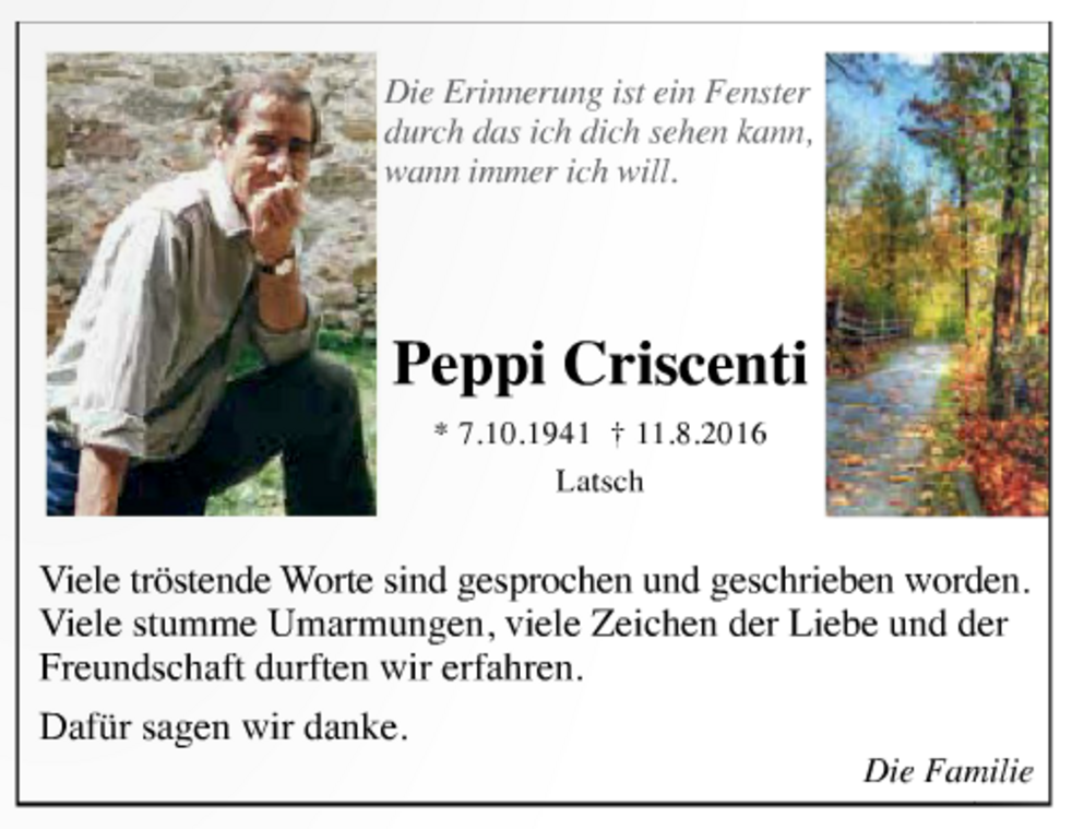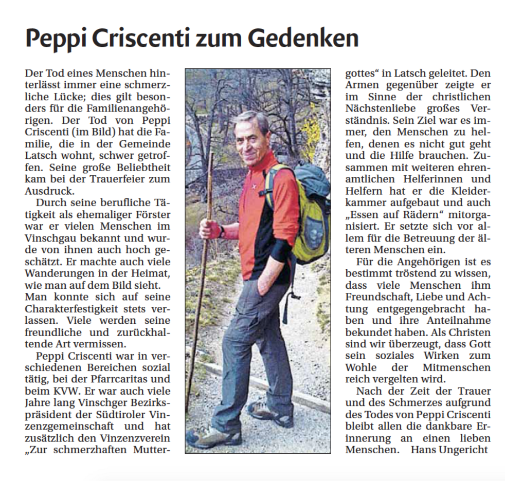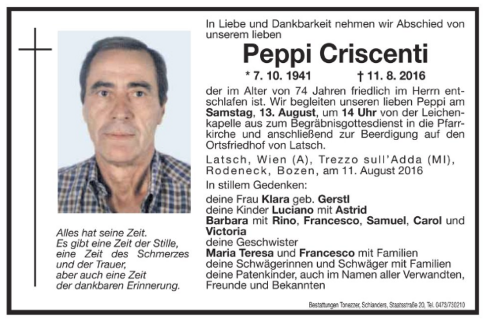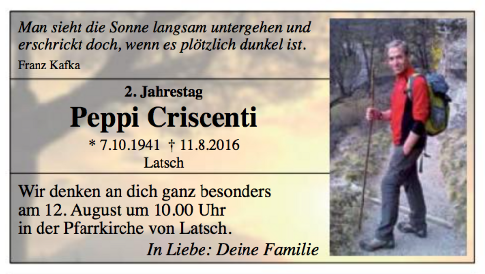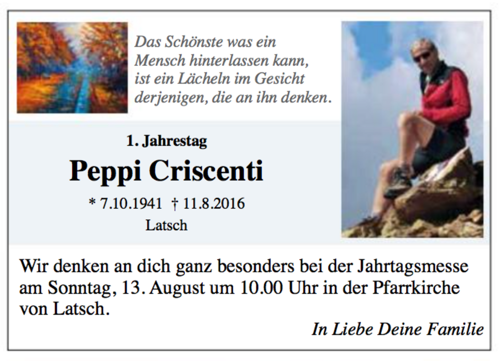 Wir begleiten unseren lieben Peppi am Samstag, 13. August, um 14 Uhr von der Leichenkapelle aus zum Begräbnisgottesdienst in die Pfarrkirche und anschließend zur Beerdigung auf den Ortsfriedhof von Latsch.