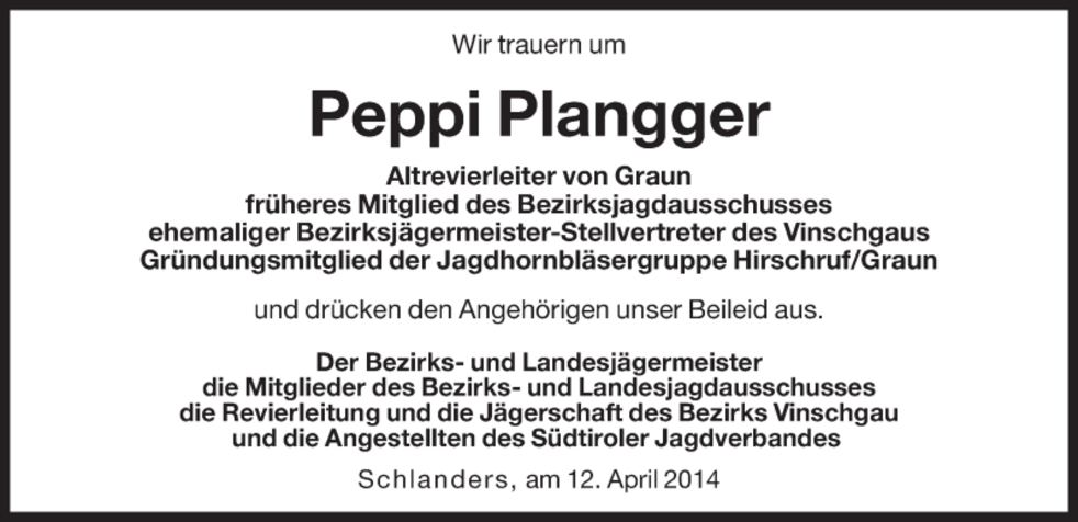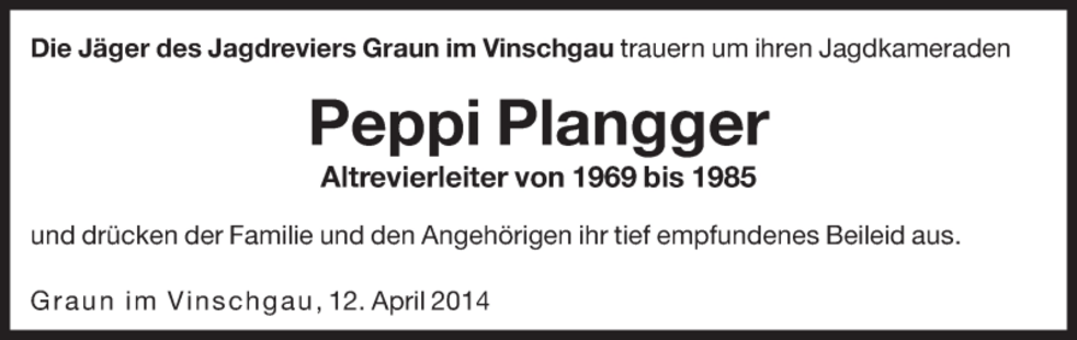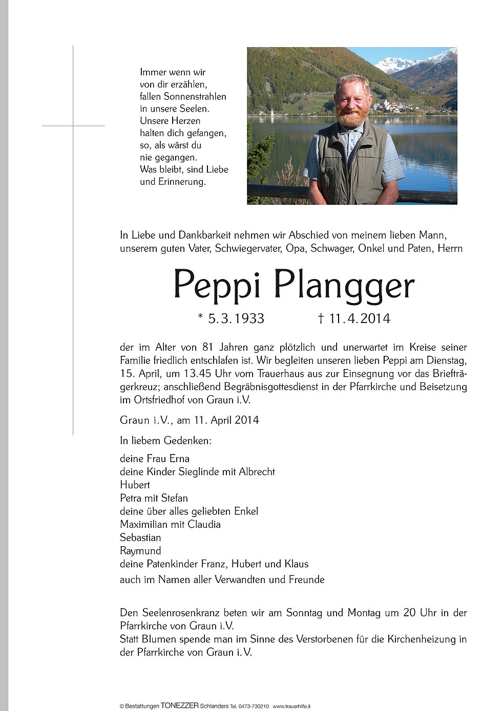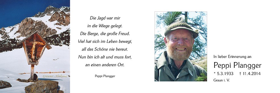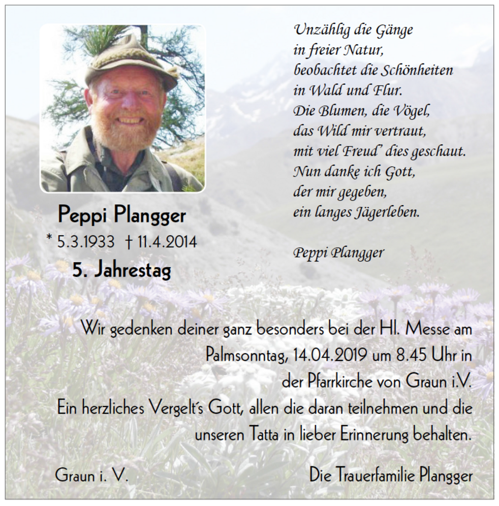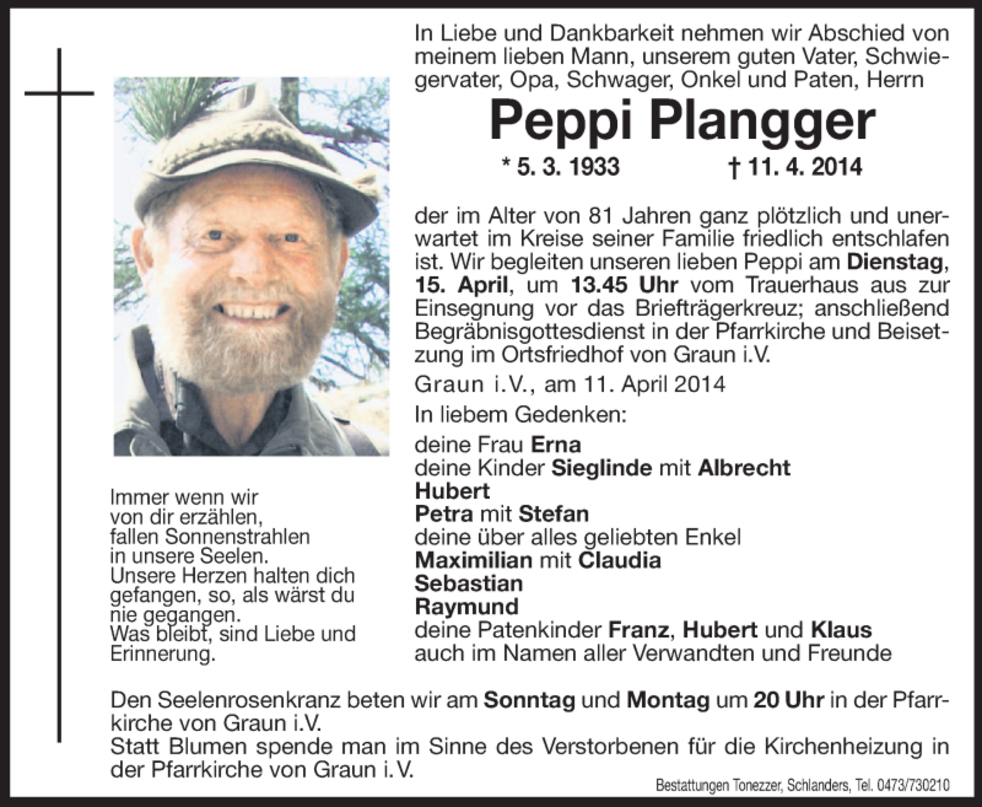 Wir begleiten unseren lieben Peppi am Dienstag, 15. April, um 13.45 Uhr vom Trauerhaus aus zur Einsegnung vor das Briefträgerkreuz; anschließend Begräbnisgottesdienst in der Pfarrkirche und Beisetzung im Ortsfriedhof von Graun i.V.