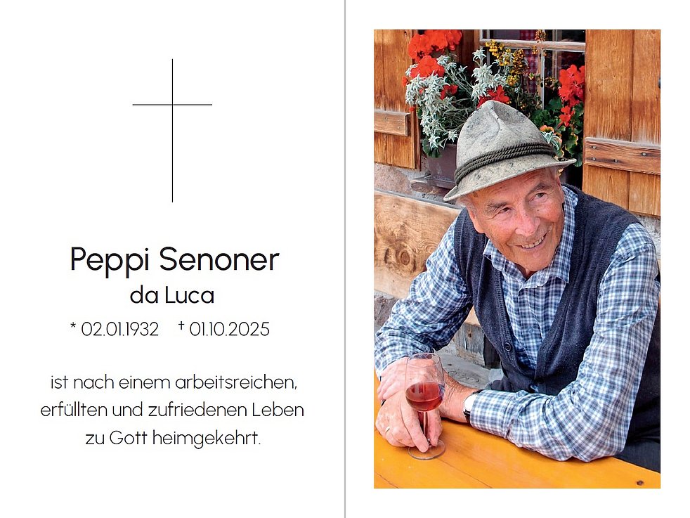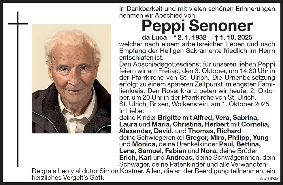 Den Abschiedsgottesdienst für unseren lieben Peppi feiern wir am Freitag, den 03. Oktober, um 14.30 Uhr in der Pfarrkirche von St. Ulrich.