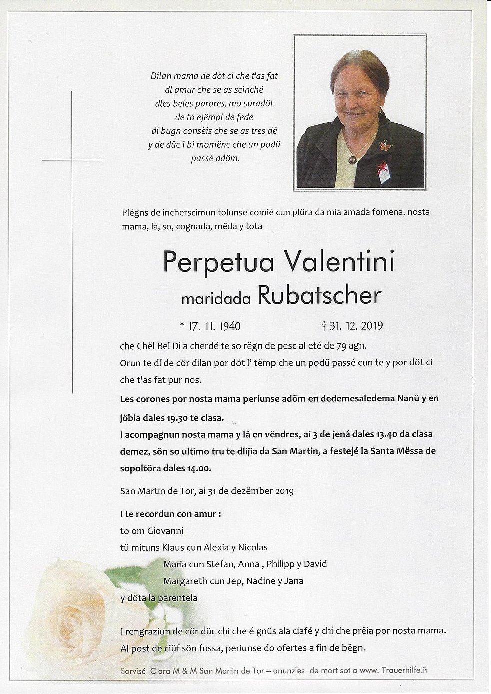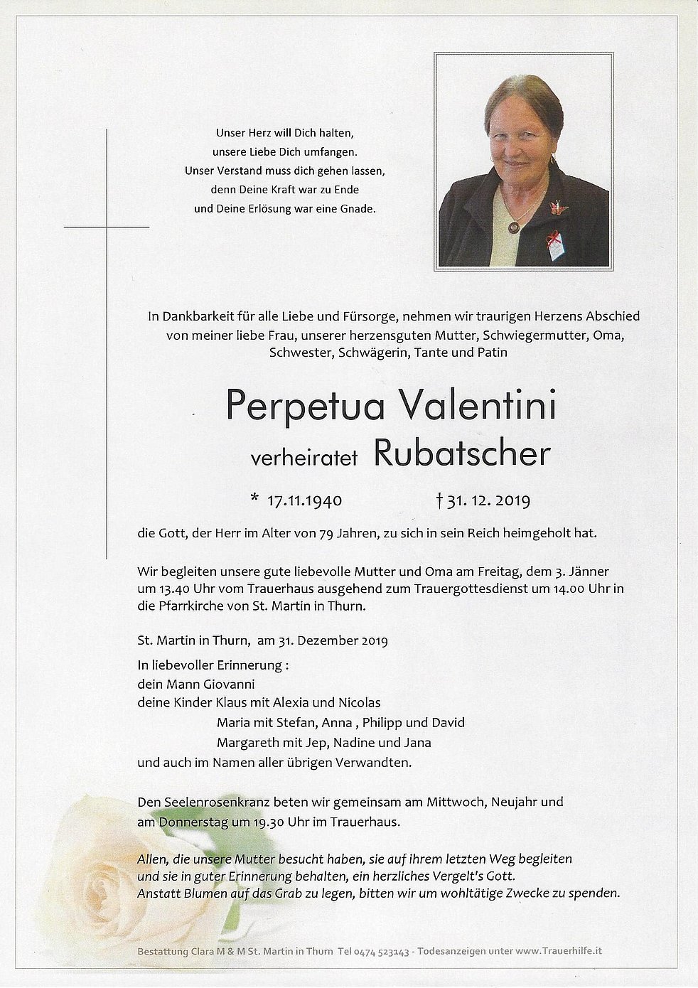 Wir begleiten unsere gute liebevolle Mutter und Oma am Freitag, dem 3. Jänner um 13.40 Uhr vom Trauerhaus ausgehend zum Trauergottesdienst um 14.00 Uhr in die Pfarrkirche von St. Martin in Thurn.
