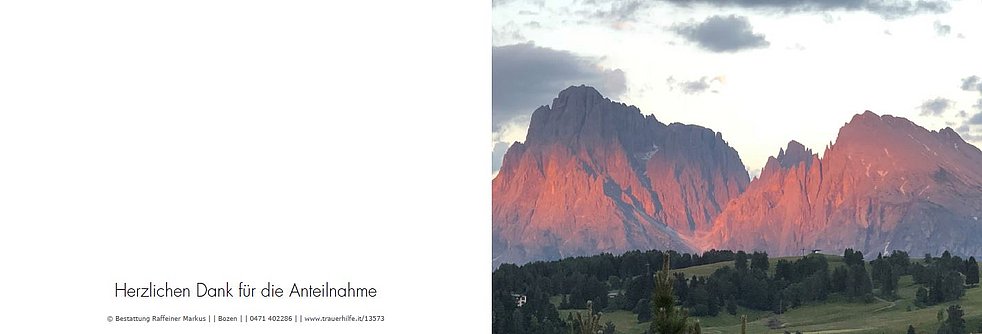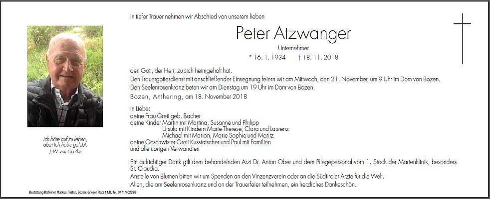 Anstelle von Blumen, bitten wir um Spenden an den Vinzenzverein oder an die Südtiroler Ärzte für die Welt.