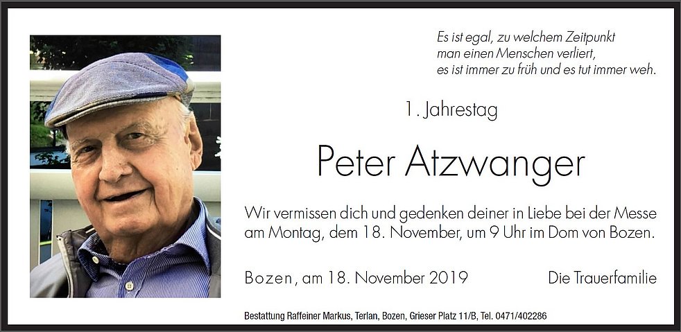 Den Trauergottesdienst mit anschlieβender Einsegnung feiern wir am Mittwoch, dem 21. November, um 9 Uhr im Dom von Bozen.