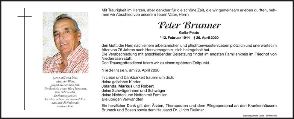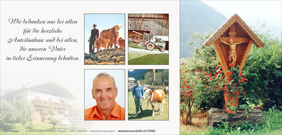 Die Verabschiedung mit anschließender Beisetzung findet im engsten Familienkreis im Friedhof von Niederrasen statt.