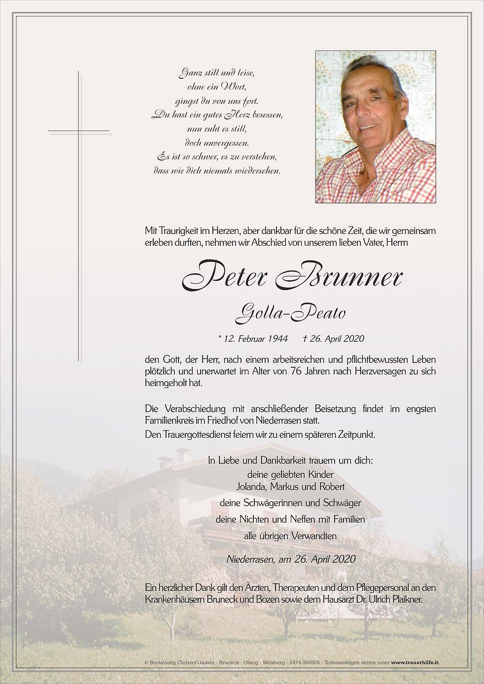 Der nachträgliche Trauergottesdienst findet am Samstag, dem 10. Oktober, um 14 Uhr in der Pfarrkirche von Niederrasen statt.