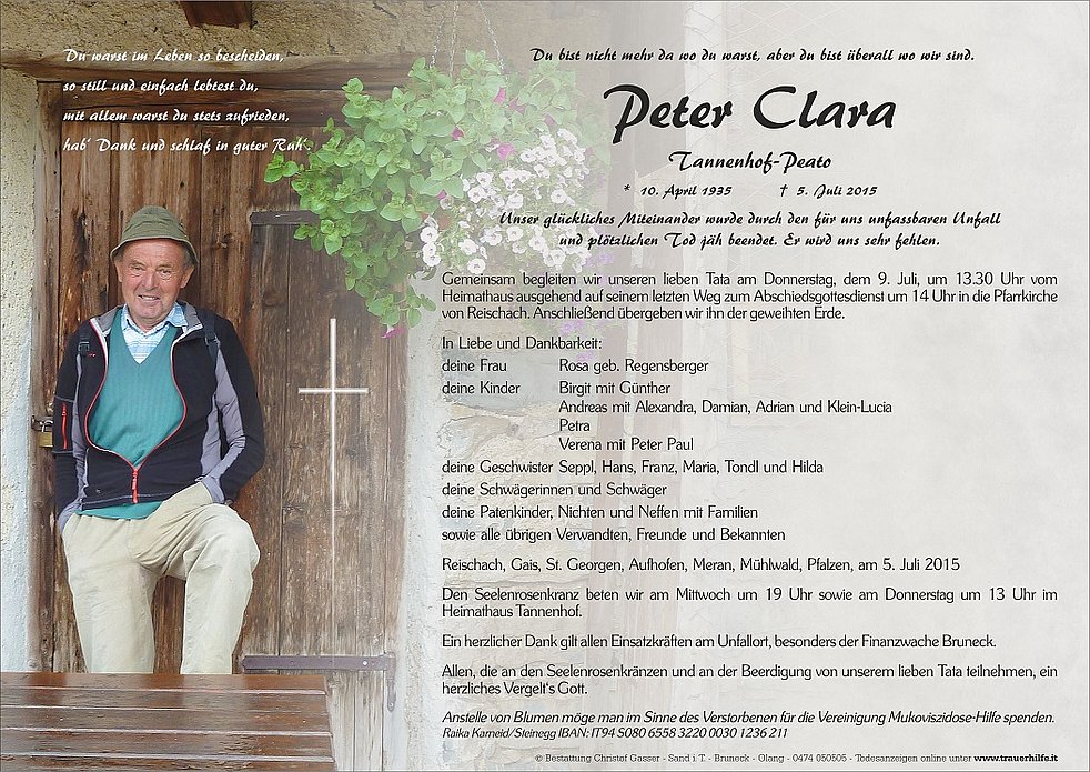 Gemeinsam begleiten wir unseren lieben Tata am Donnerstag, dem 9. Juli, um 13.30 Uhr vom Heimathaus ausgehend auf seinem letzten Weg zum Abschiedsgottesdienst um 14 Uhr in die Pfarrkirche von Reischach. Anschließend übergeben wir ihn der geweihten Erde.