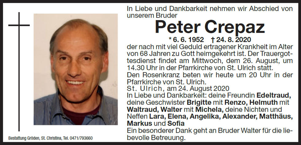 Der Trauergottesdienst findet am Mittwoch, dem 26. August, um 14:30 Uhr in der Pfarrkirche von St. Ulrich statt.