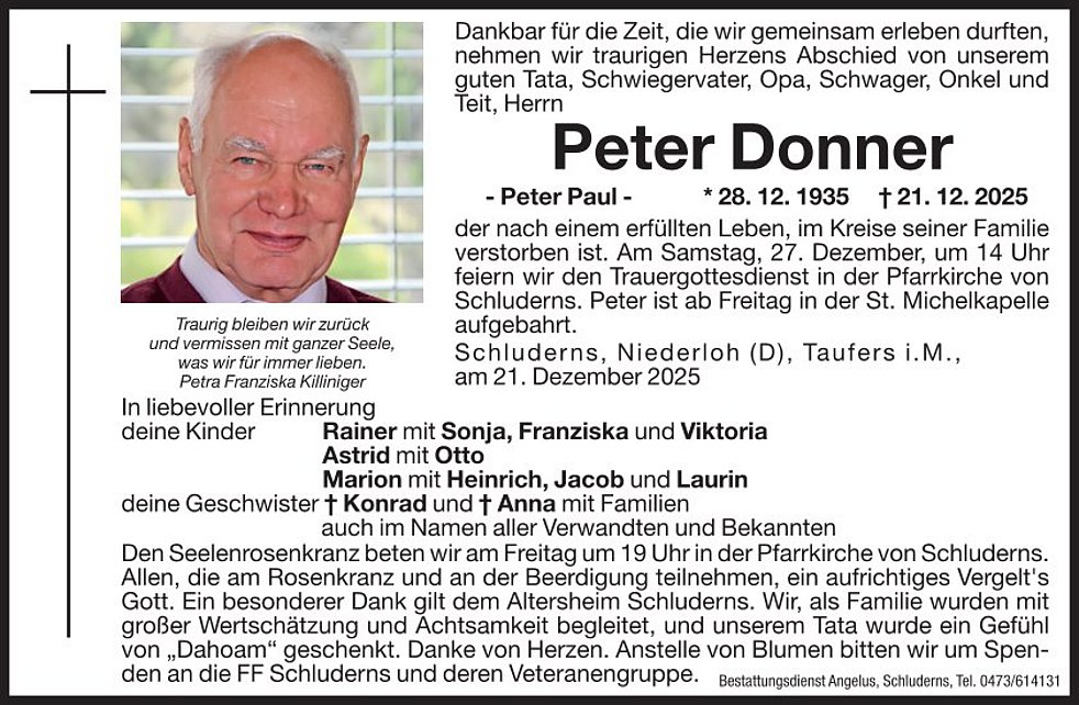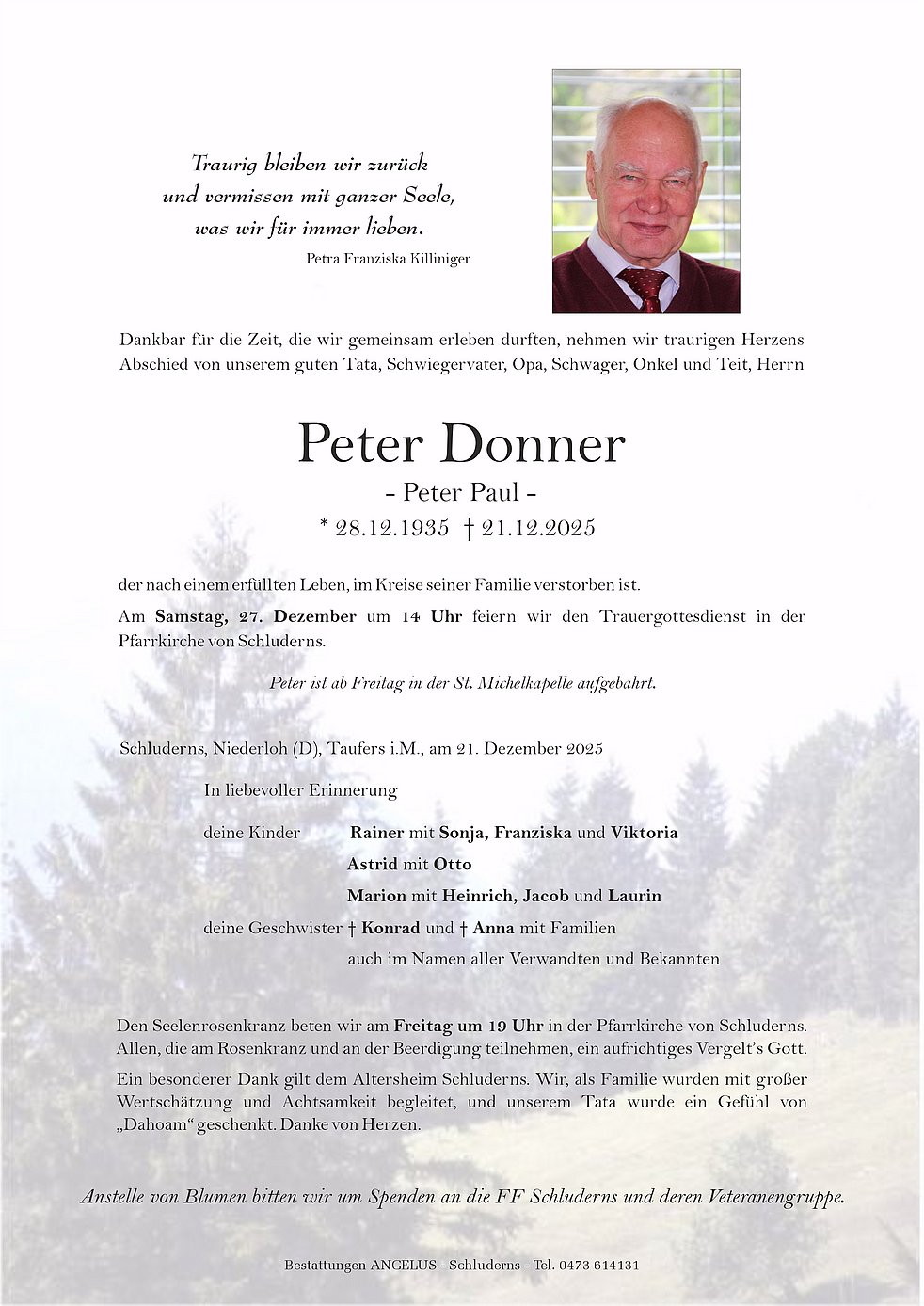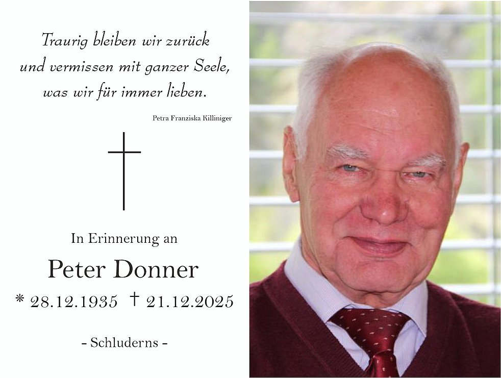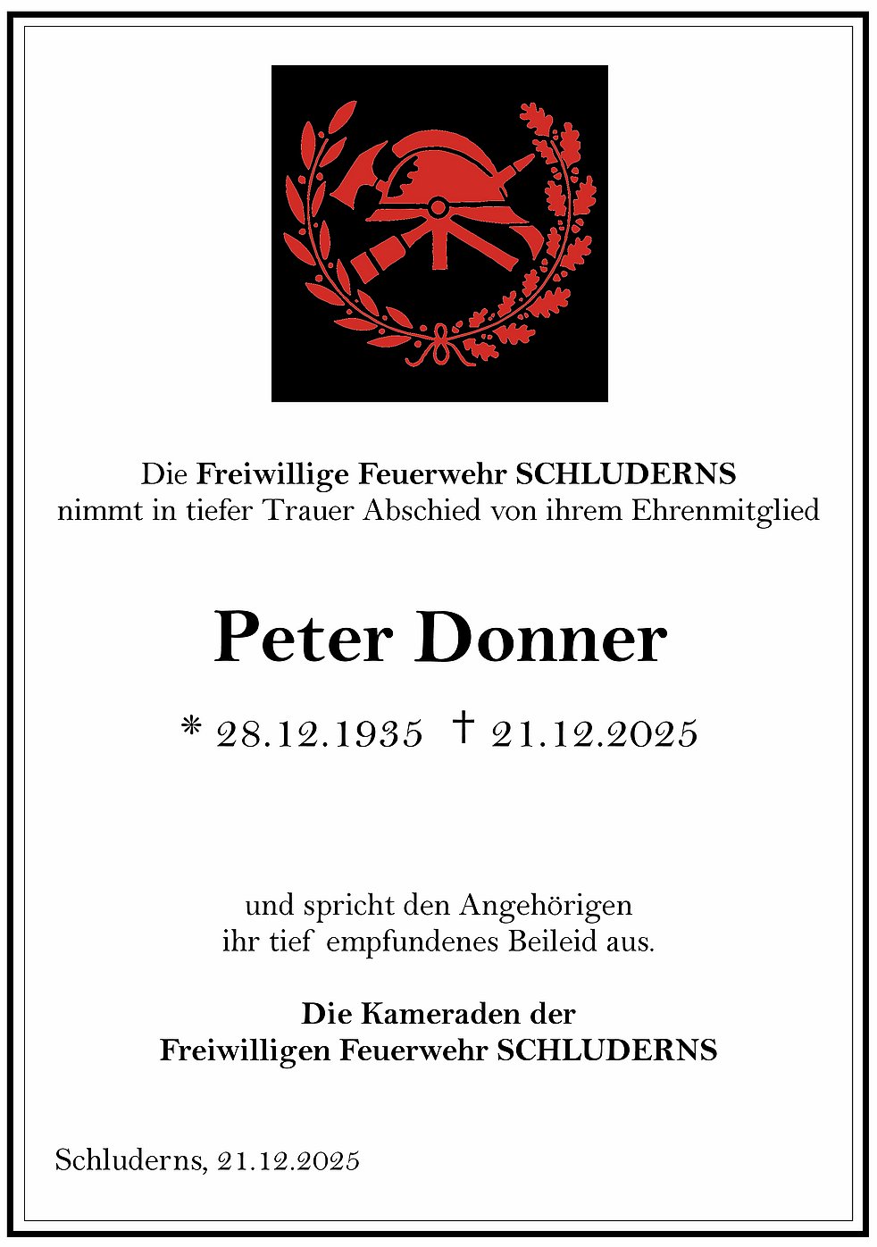 Die Freiwillige Feuerwehr Schluderns nimmt aufrichtig Anteil an der Trauer und dem Schmerz den die Familie Donner durch das Ableben unseres Ehrenmitgliedes Donner Peter erlitten hat und drücken den Angehörigen unser herzlichstes Beileid aus.