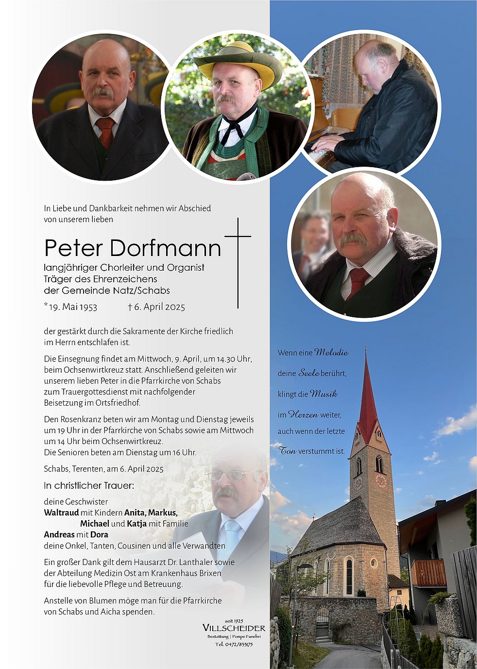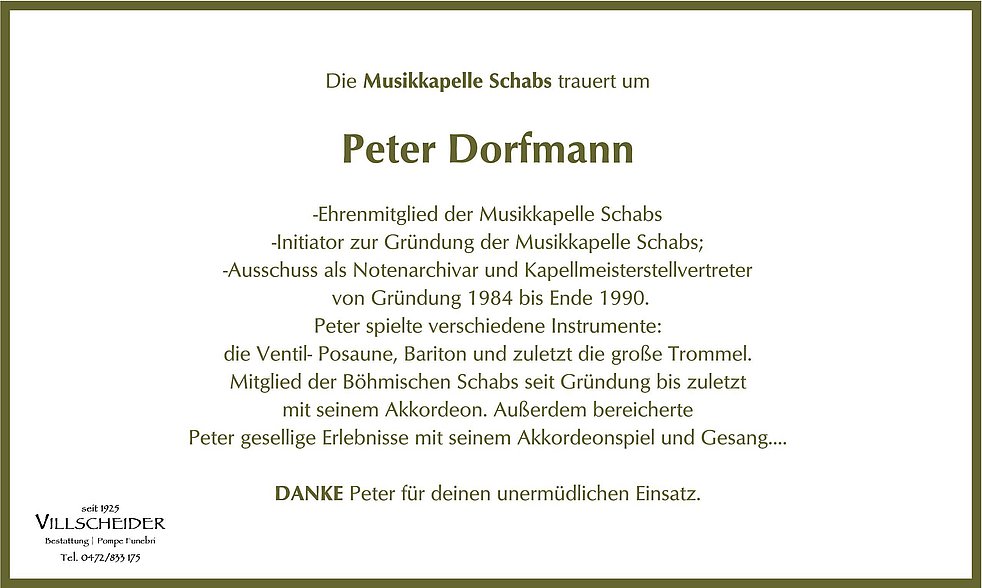 die KVW-Ortsgruppe Schabs bedankt ich für all die schönen gemeinsamen Stunden, die wir mit dir erleben durften. Du hast dir immer die Zeit genommen, mit uns die Feste zu feiern und unsere Veranstaltungen zu verschönern. Wir haben dich vor einigen Jahren auch deshalb als eines unserer ersten Mitglieder für deinen ehrenamtlichen Einsatz für die Dorfgemeinschaft geehrt. Du wirst uns weiterhin in guter Erinnerung bleiben.