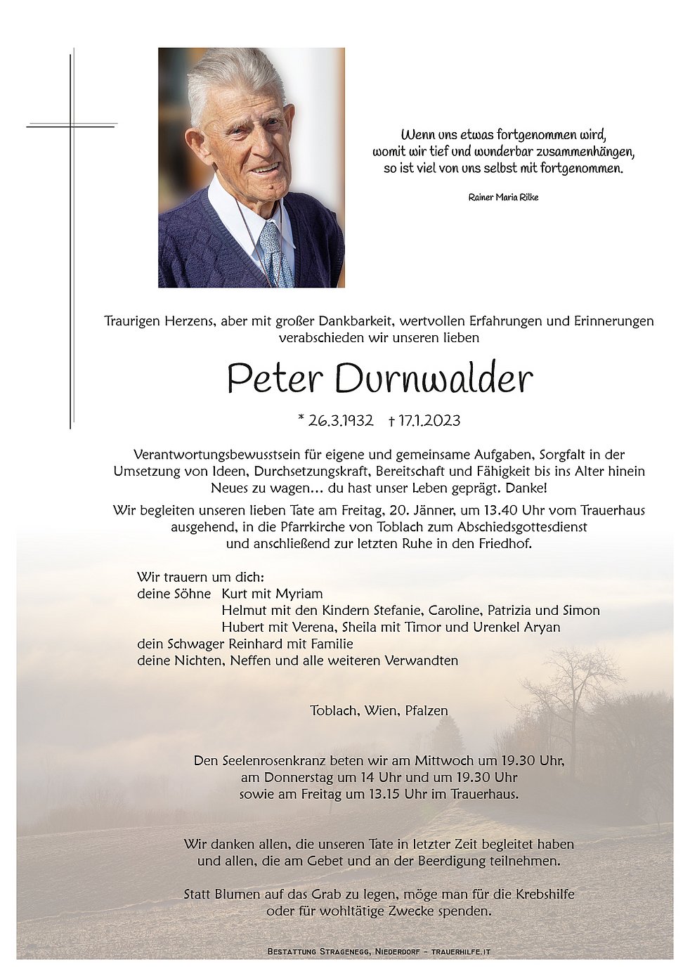 Wir begleiten unseren lieben Tate am Freitag, 20. Jänner, um 13.40 Uhr vom Trauerhaus ausgehend, in die Pfarrkirche von Toblach zum Abschiedsgottesdienst und anschließend zur letzten Ruhe in den Friedhof.