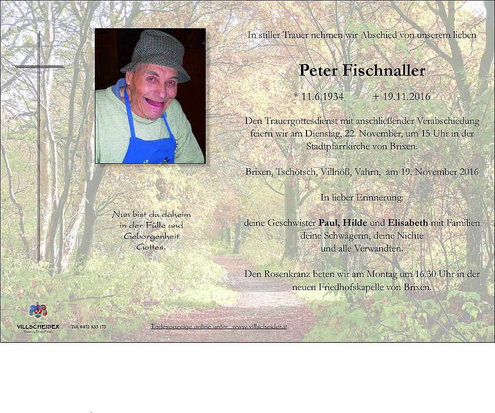 Den Trauergottesdienst mit anschließender Verabschiedung feiern wir am Dienstag, 22. November, um 15 Uhr in der Stadtpfarrkirche von Brixen.