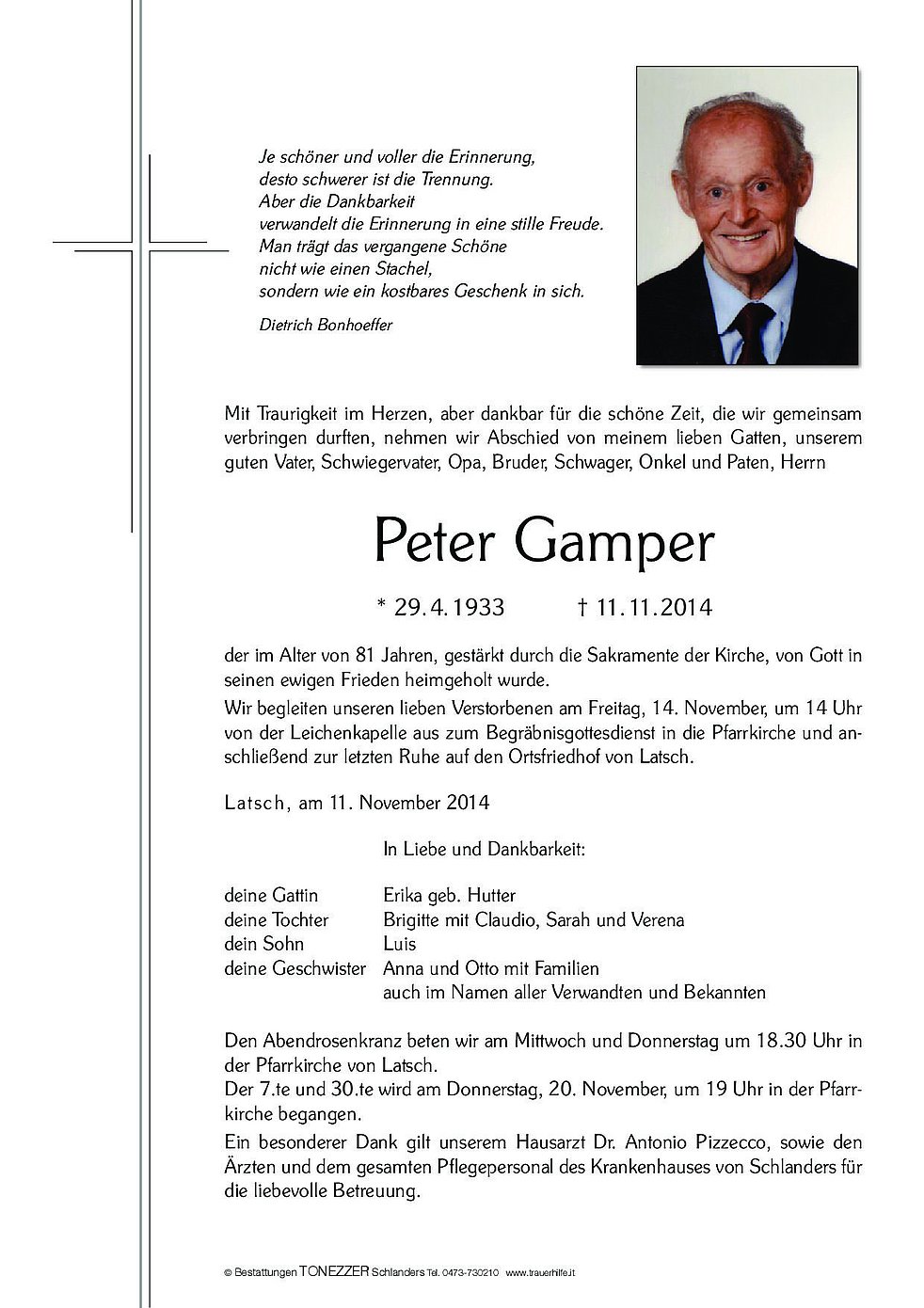 Wir begleiten unseren lieben Verstorbenen am Freitag, 14. November, um 14 Uhr von der Leichenkapelle aus zum Begräbnisgottesdienst in die Pfarrkirche und anschließend zur letzten Ruhe auf den Ortsfriedhof von Latsch.