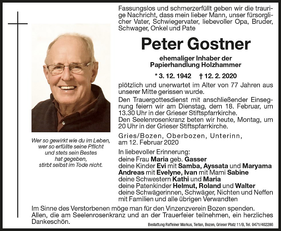 Im Sinne des Verstorbenen möge man für den Vinzenzverein Bozen spenden.