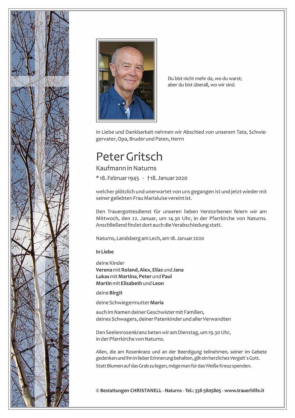 Den Trauergottesdienst für unseren lieben Verstorbenen feiern wir am Mittwoch, den 22. Januar, um 14.30 Uhr, in der Pfarrkirche von Naturns. Anschließend findet dort auch die Verabschiedung statt.