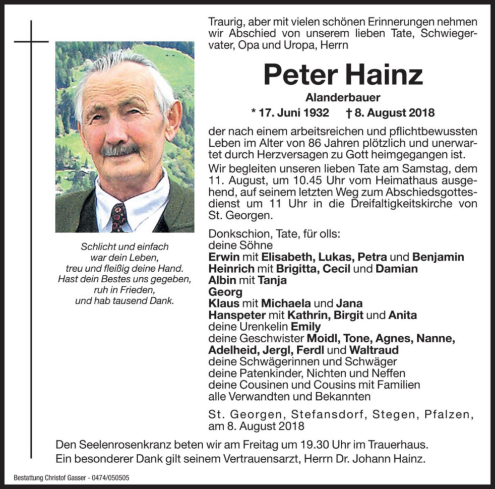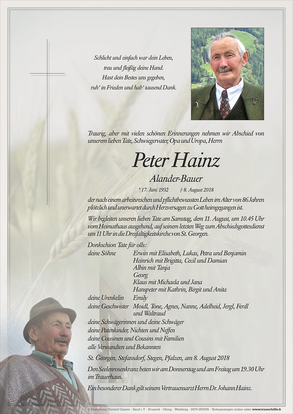 Wir begleiten unseren lieben Tate am Samstag, dem 11. August, um 10.45 Uhr vom Heimathaus ausgehend, auf seinem letzten Weg zum Abschiedsgottesdienst um 11 Uhr in die Dreifaltigkeitskirche von St. Georgen.