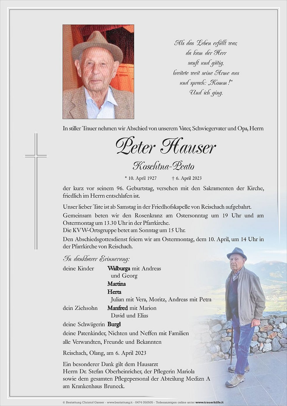Unser lieber Tate ist ab Samstag in der Friedhofskapelle von Reischach aufgebahrt.