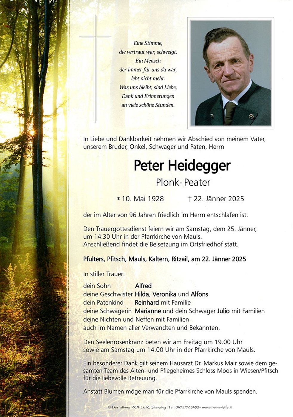 Ein besonderer Dank gilt seinem Hausarzt Dr. Markus Mair sowie dem gesamten Team des Alten- und Pflegeheimes Schloss Moos in Wiesen/Pfitsch für die liebevolle Betreuung.