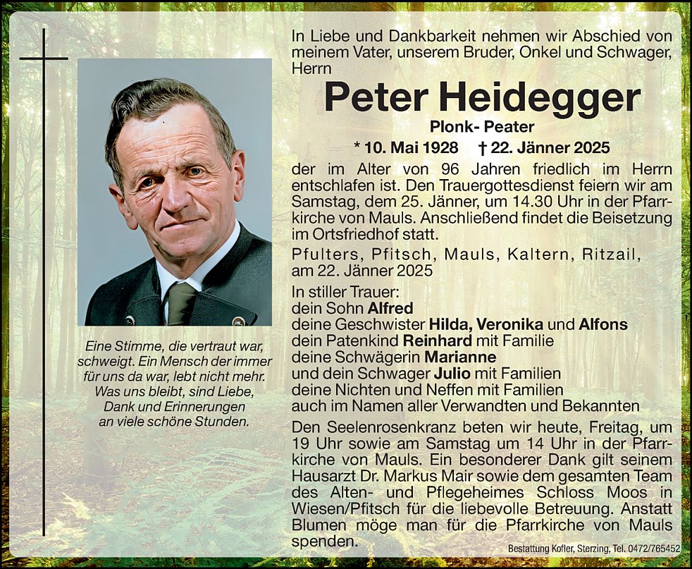 Den Trauergottesdienst feiern wir am Samstag, dem 25. Jänner, um 14.30 Uhr in der Pfarrkirche von Mauls. Anschließend findet die Beisetzung im Ortsfriedhof statt.