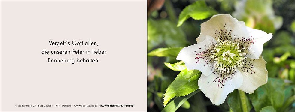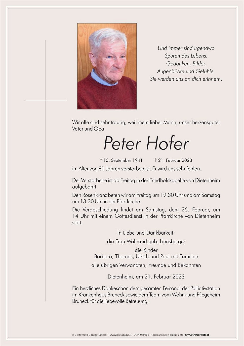 Ein herzliches Dankeschön dem gesamten Personal der Palliativstation im Krankenhaus Bruneck sowie dem Team vom Wohn- und Pflegeheim Bruneck für die liebevolle Betreuung.