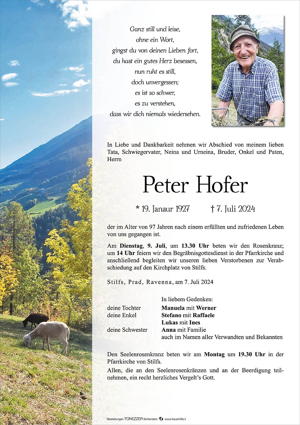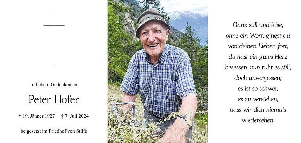Am Dienstag, 9. Juli, um 13.30 Uhr beten wir den Rosenkranz; um 14 Uhr feiern wir den Begräbnisgottesdienst in der Pfarrkirche und anschließend begleiten wir unseren lieben Verstorbenen zur Verabschiedung auf den Kirchplatz von Stilfs.
