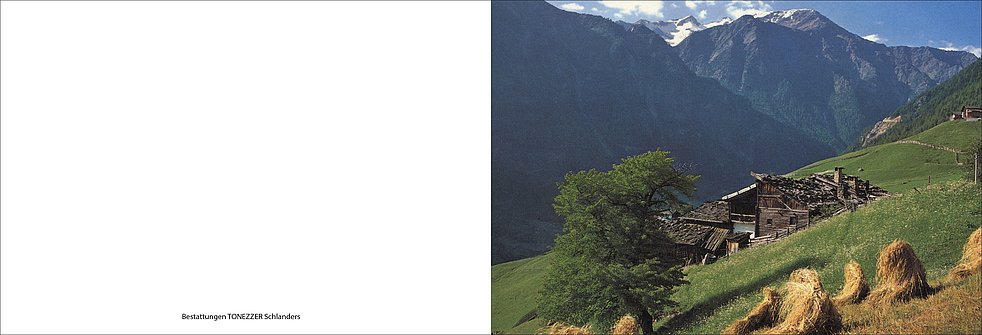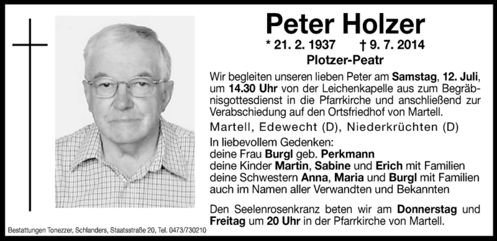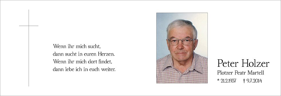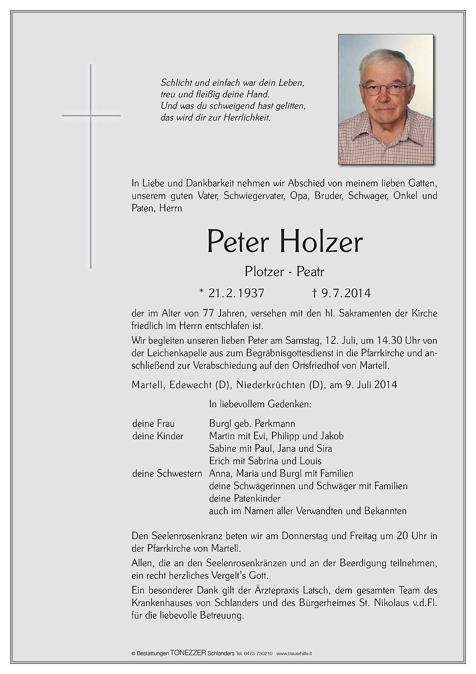 Schlicht und einfach war dein Leben, treu und fleißig deine Hand. Und was du schweigend hast gelitten, das wird dir zur Herrlichkeit. In Liebe und Dankbarkeit nehmen wir Abschied von meinem lieben Gatten, unserem guten Vater, Schwiegervater, Opa, Bruder, Schwager, Onkel und Paten, Herrn Peter Holzer Plotzer - Peatr * 21.2.1937 † 9.7.2014 der im Alter von 77 Jahren, versehen mit den hl. Sakramenten der Kirche friedlich im Herrn entschlafen ist. Wir begleiten unseren lieben Peter am Samstag, 12. Juli, um 14.30 Uhr von der Leichenkapelle aus zum Begräbnisgottesdienst in die Pfarrkirche und anschließend zur Verabschiedung auf den Ortsfriedhof von Martell. Martell, Edewecht (D), Niederkrüchten (D), am 9. Juli 2014 In liebevollem Gedenken: deine Frau Burgl geb. Perkmann deine Kinder Martin mit Evi, Philipp und Jakob Sabine mit Paul, Jana und Sira Erich mit Sabrina und Louis deine Schwestern Anna, Maria und Burgl mit Familien deine Schwägerinnen und Schwäger mit Familien deine Patenkinder auch im Namen aller Verwandten und Bekannten Den Seelenrosenkranz beten wir am Donnerstag und Freitag um 20 Uhr in der Pfarrkirche von Martell. Allen, die an den Seelenrosenkränzen und an der Beerdigung teilnehmen, ein recht herzliches Vergelt’s Gott. Ein besonderer Dank gilt der Ärztepraxis Latsch, dem gesamten Team des Krankenhauses von Schlanders und des Bürgerheimes St. Nikolaus v.d.Fl. für die liebevolle Betreuung.