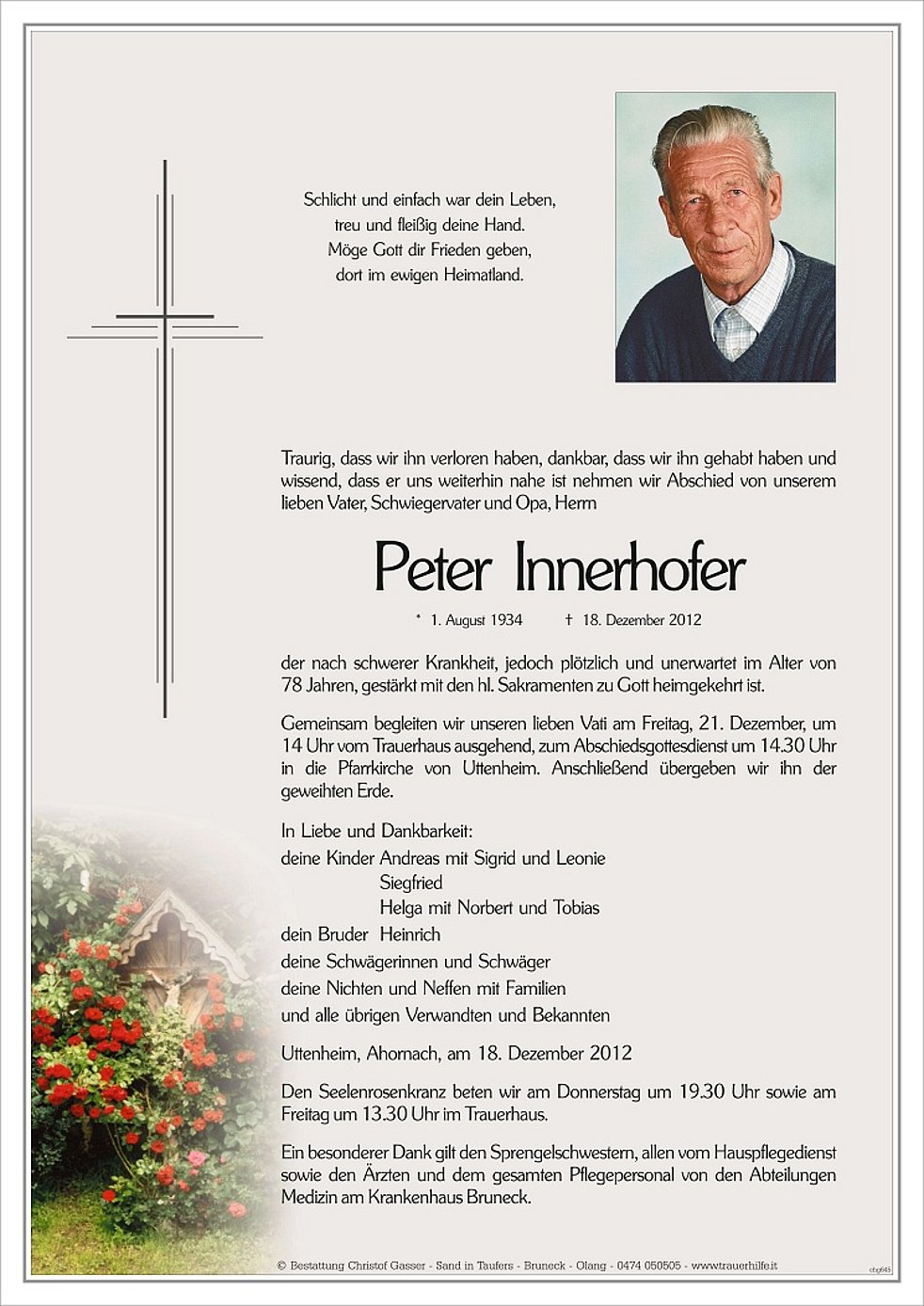 Wir begleiten unseren lieben Papa am Samstag, dem 2. Mai, um 13.45 Uhr vom Heimathaus ausgehend zum Trauergottesdienst um 14.30 Uhr in die Pfarrkirche von St. Johann und anschließend zur letzten Ruhe in den Ortsfriedhof.