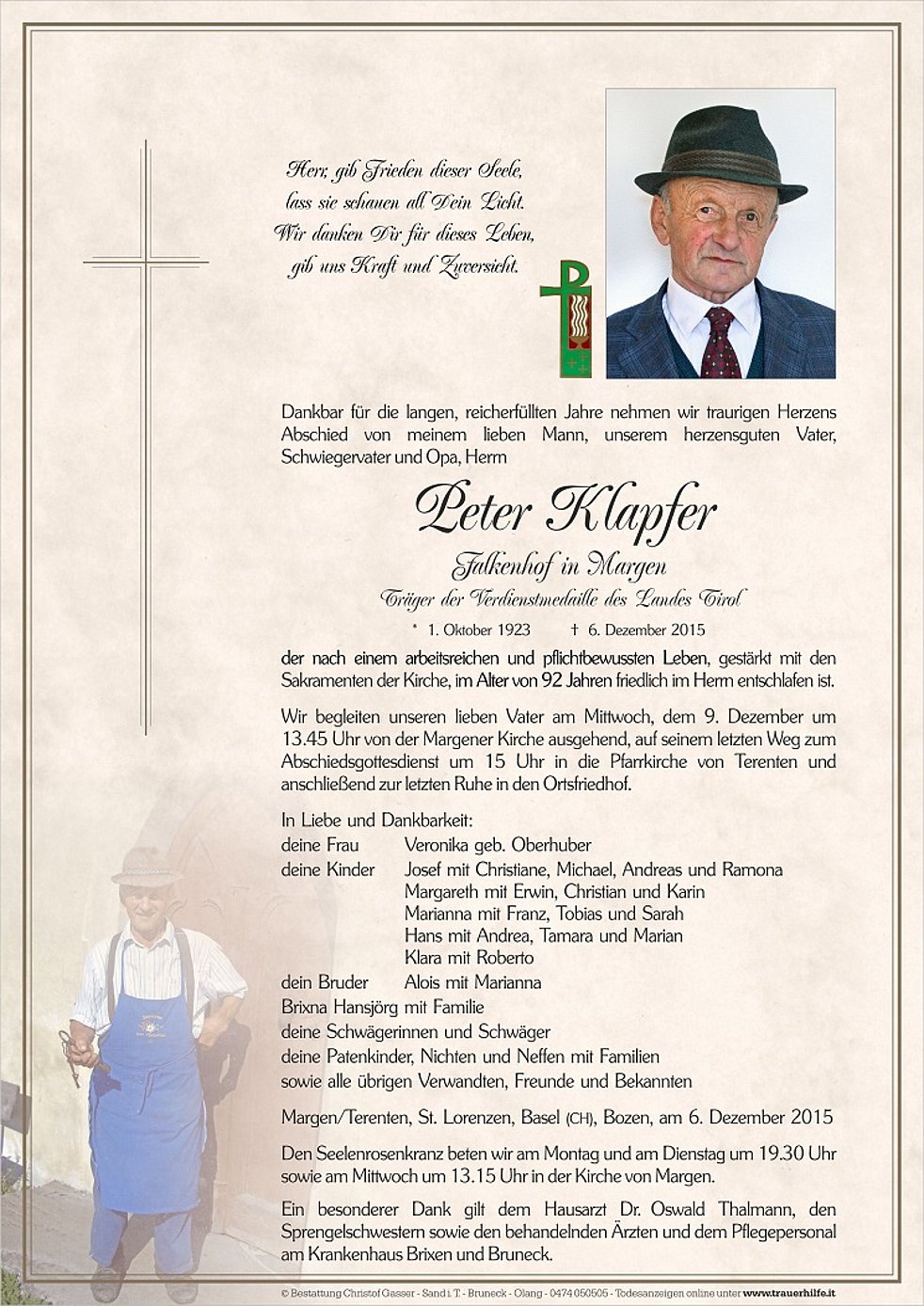 der nach einem arbeitsreichen und pflichtbewussten Leben, gestärkt mit den Sakramenten der Kirche, im Alter von 92 Jahren friedlich im Herrn entschlafen ist.