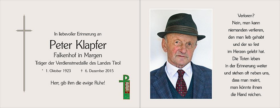 Ein besonderer Dank gilt dem Hausarzt Dr. Oswald Thalmann, den Sprengelschwestern sowie den behandelnden Ärzten und dem Pflegepersonal am Krankenhaus Brixen und Bruneck.